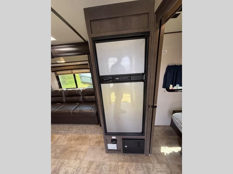 Straight in from the door is a refrigerator. Also along the road side is the slide out with a jack-knife sofa.