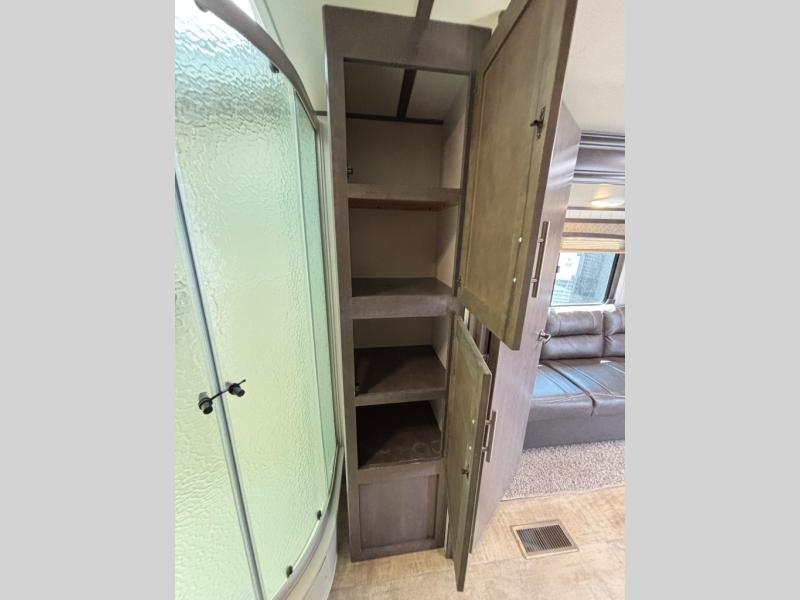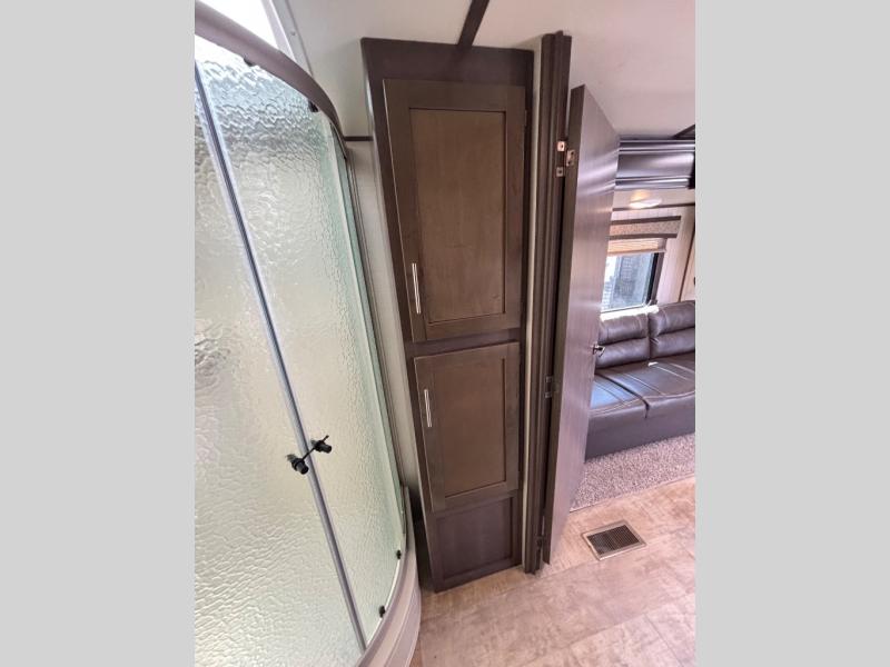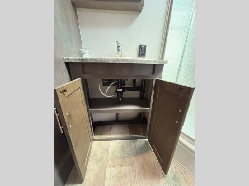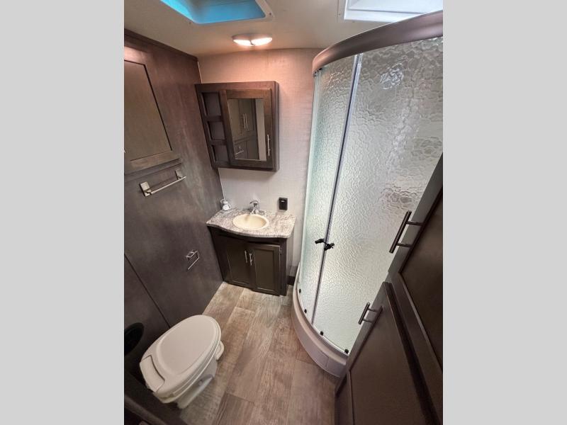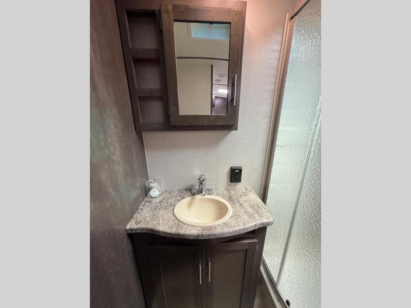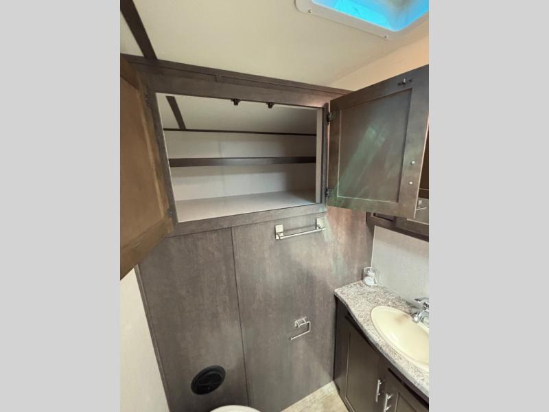 On the inside notice that the full bathroom is located in the rear of this model. There is a corner shower, toilet, linen cabinet, and a vanity with sink. You will also find an overhead medicine cabinet as well.