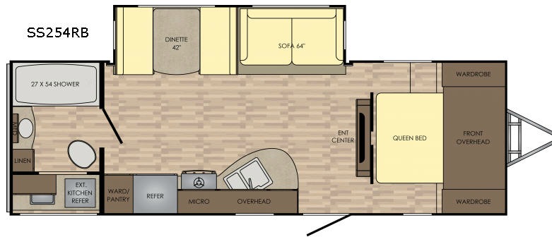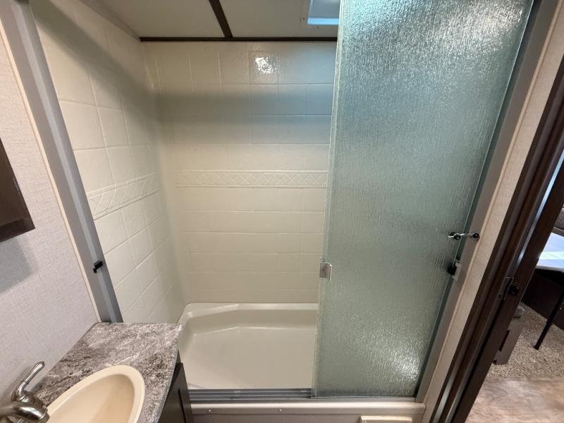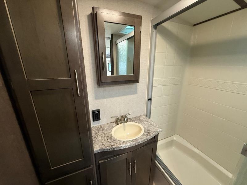 In the very rear of this Sunset Trail Super Lite you will find a convenient bathroom including a 27" x 54" shower, toilet, and vanity with sink. There is also a linen cabinet for towels and toiletries.