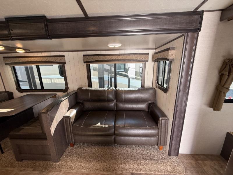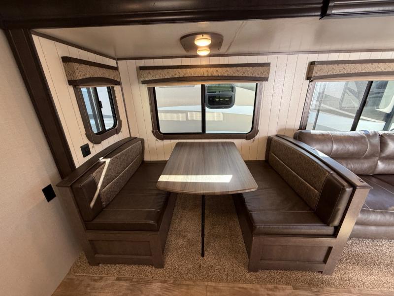 Step inside and notice how open it feels with the large sofa and booth dinette slide fully extended. This provides plenty of daytime seating for relaxing, dining, or just kicking back watching TV. If you need added space at night you can create sleeping space from either quickly. The nearby entertainment center is easily viewable from either spot.