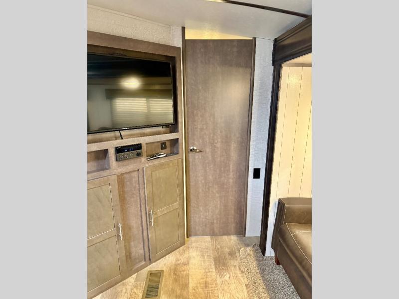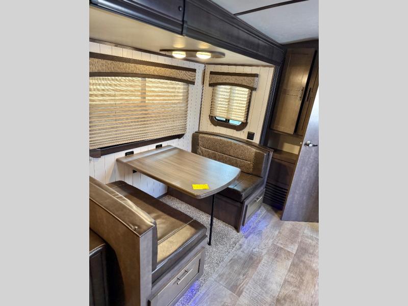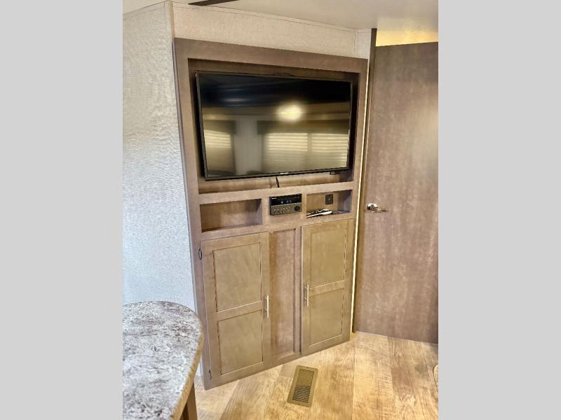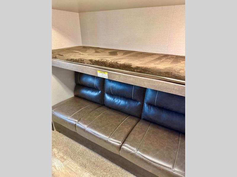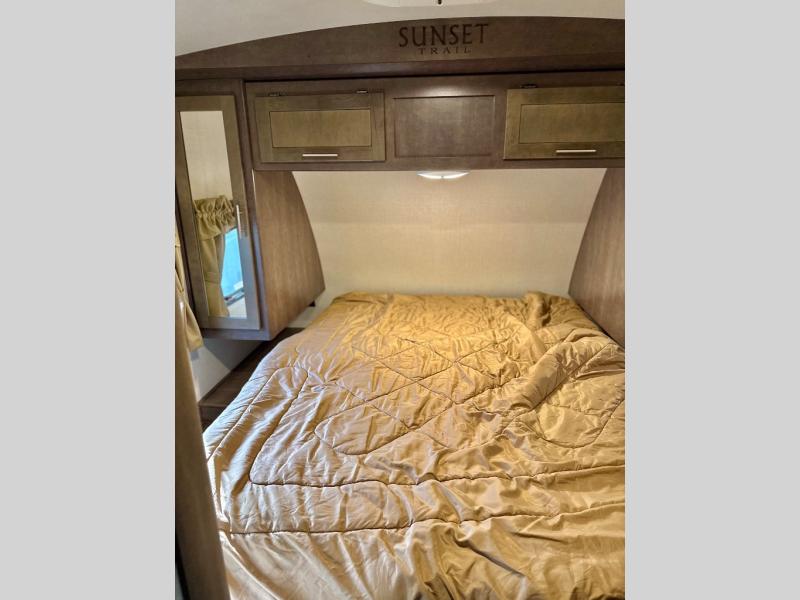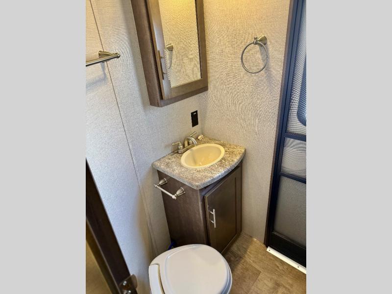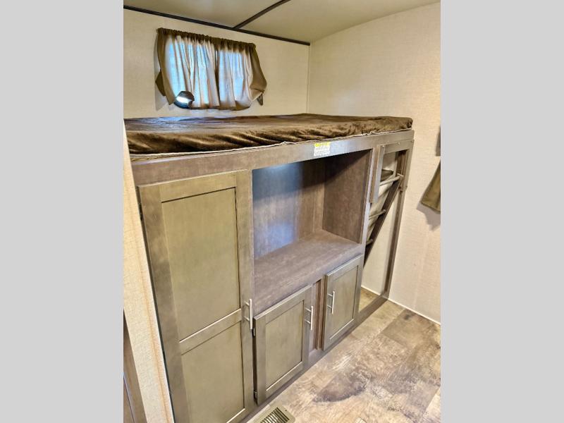 The rear of this Sunset Trail Super Lite provides a place that the kids are sure to appreciate. It is also a great space when spending time with camping guests. The private bunkhouse features a slide out jack-knife sofa with a 28" x 74" flip up bunk above along the road side. Opposite enjoy an entertainment center with storage, and another bunk above. There is a private half bath off the bunk room with its own private entry to the outside. Here you will find a toilet and vanity with sink.