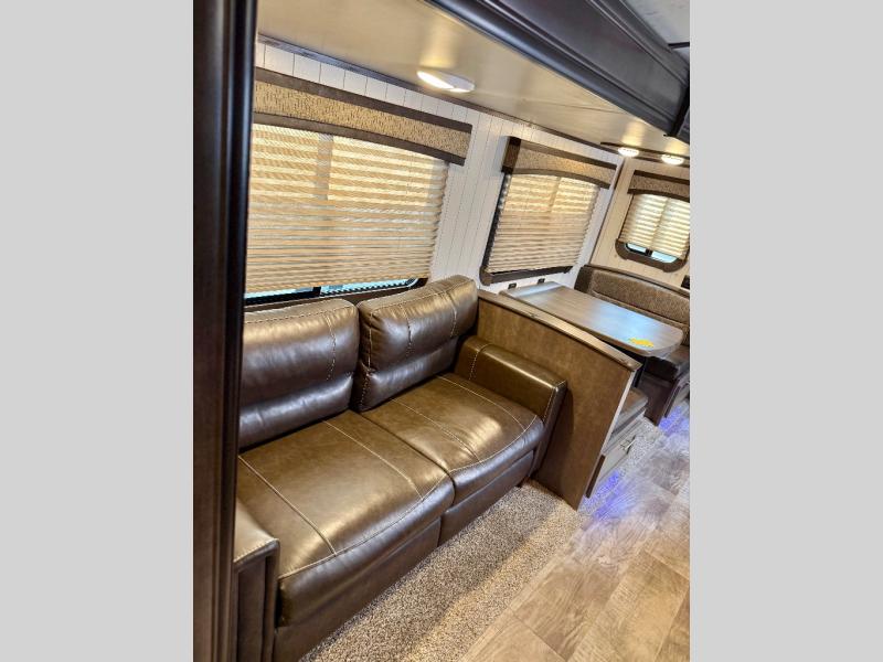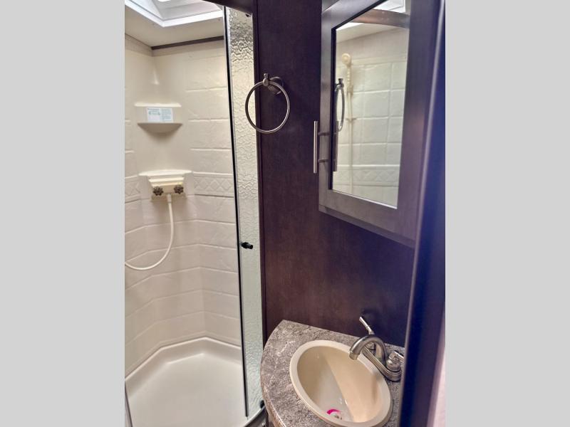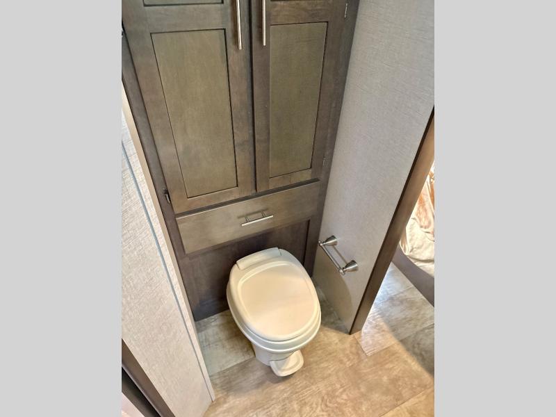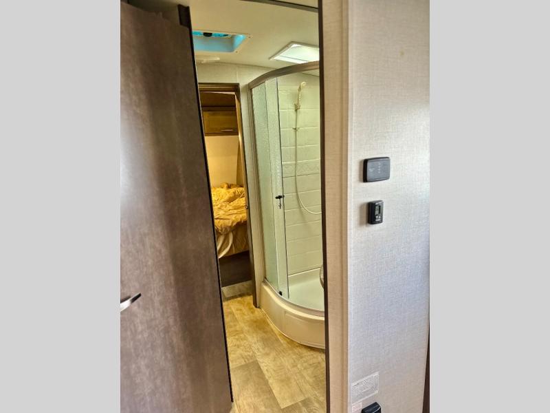 To the right of that same entry door you will find a handy closet for your coats and shoes. Around the corner toward the front there is a pantry just off the dinette slide, and the entrance into the walk-through complete bath which features a sink, corner shower, and toilet with linen/wardrobe storage above.