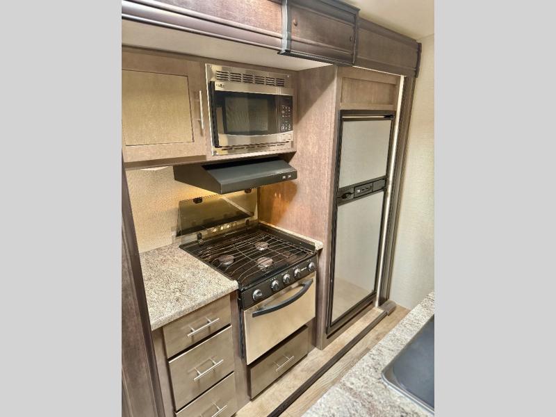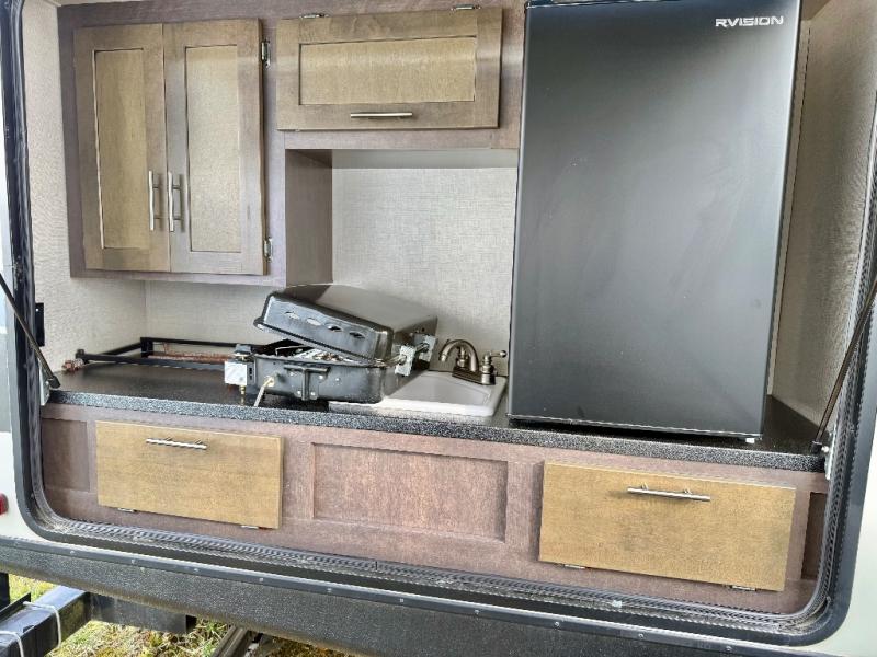 On the outside you will find a kitchen area beneath the curb side bunk. The exterior refrigerator allows you to keep drinks easily accessible, and there is also a single sink, plus so much more!