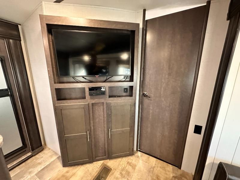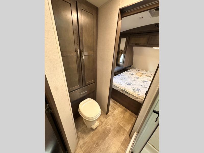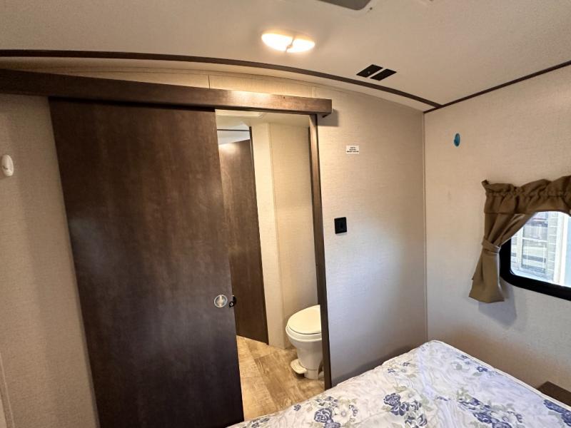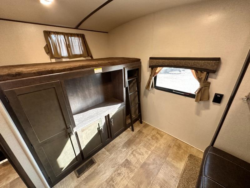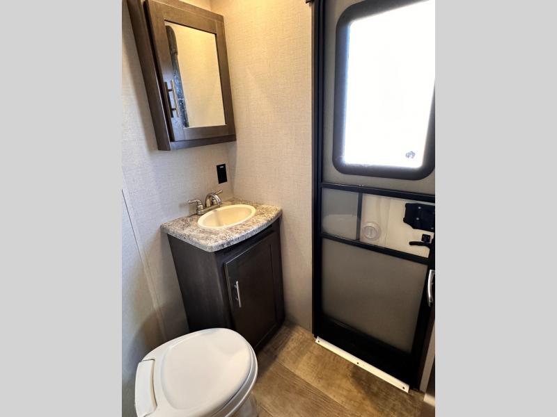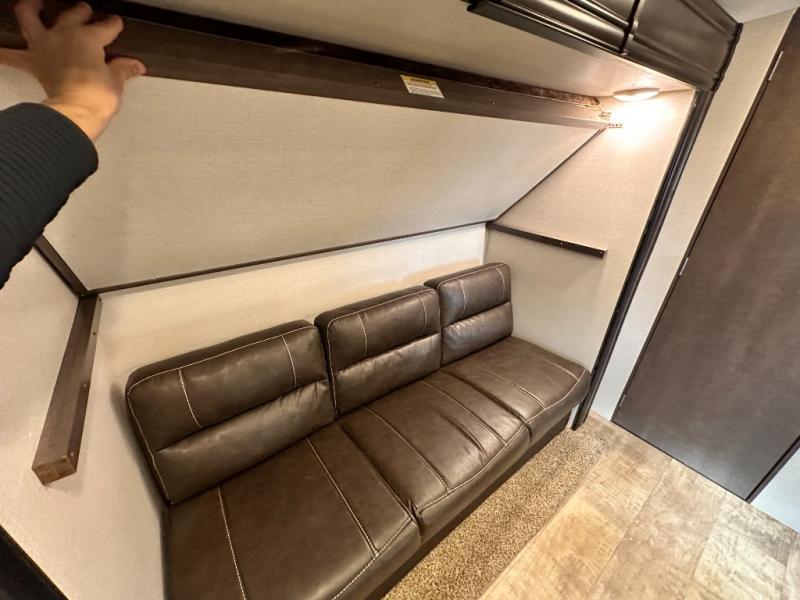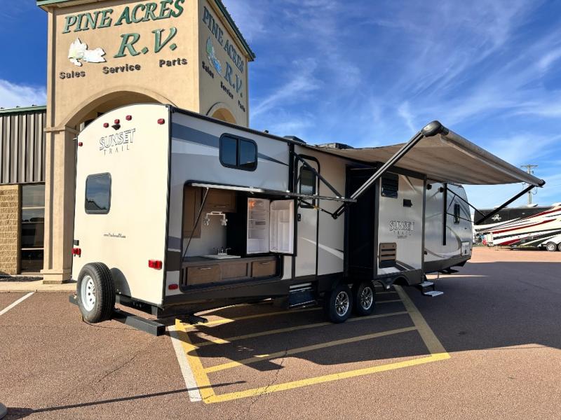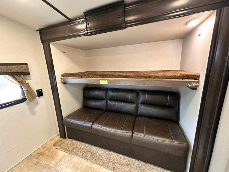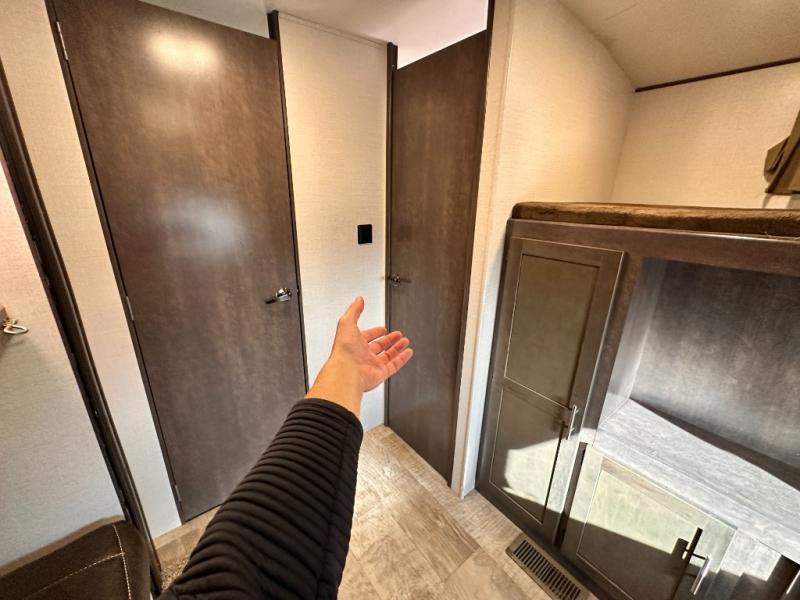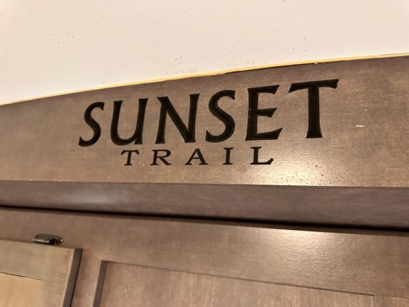 The rear of this Sunset Trail Super Lite provides a place that the kids are sure to appreciate. It is also a great space when spending time with camping guests. The private bunkhouse features a slide out jack-knife sofa with a 28" x 74" flip up bunk above along the road side. Opposite enjoy an entertainment center with storage, and another bunk above. There is a private half bath off the bunk room with its own private entry to the outside. Here you will find a toilet and vanity with sink.
