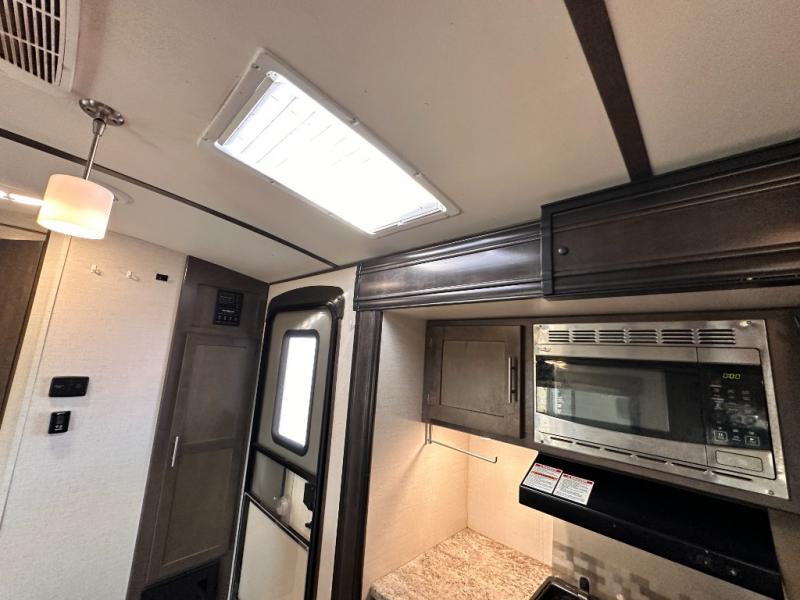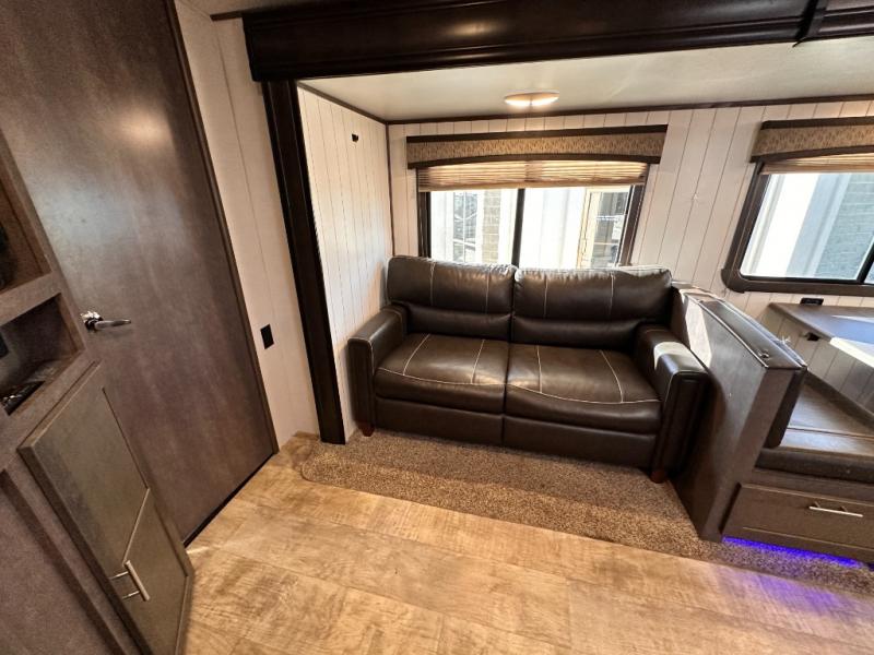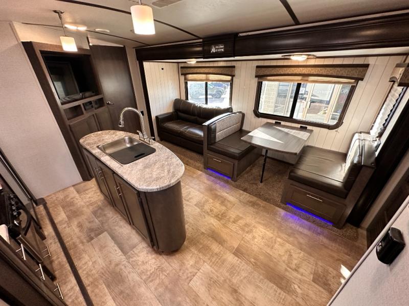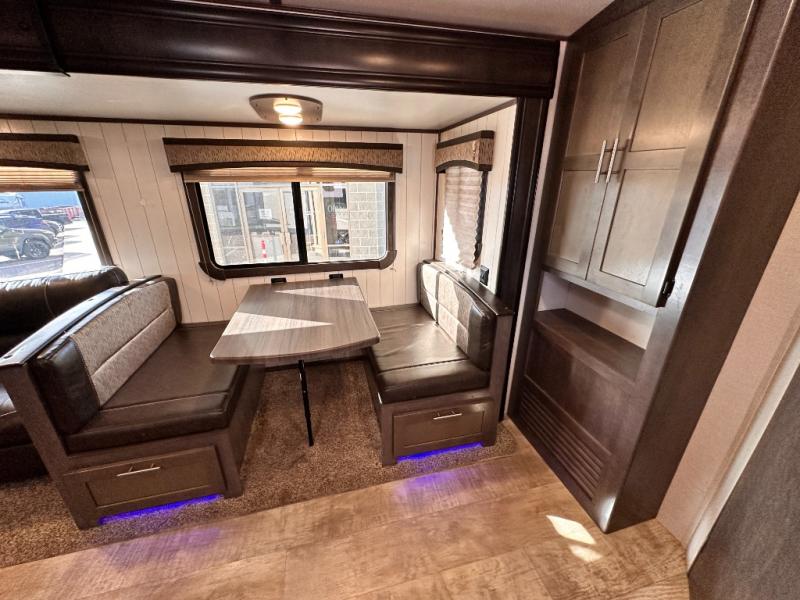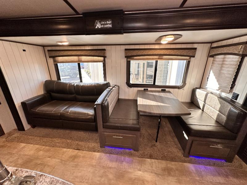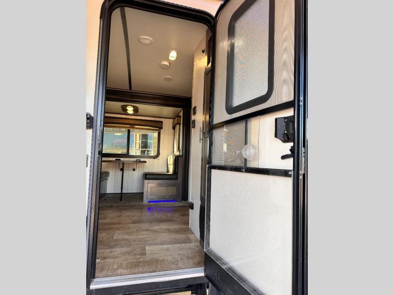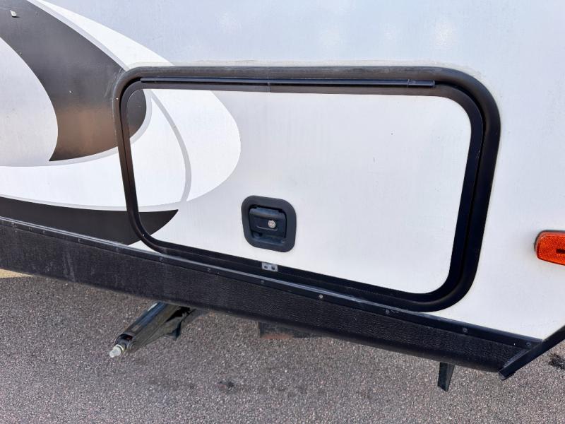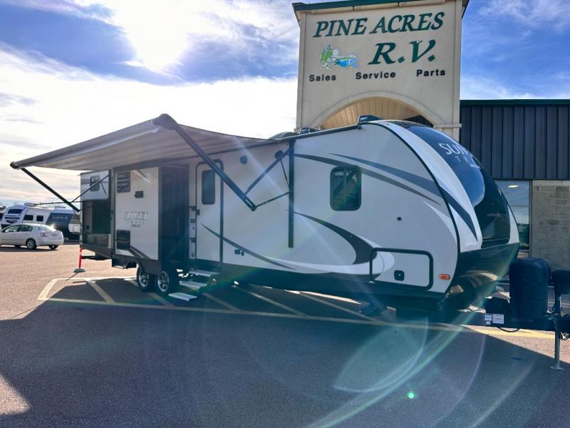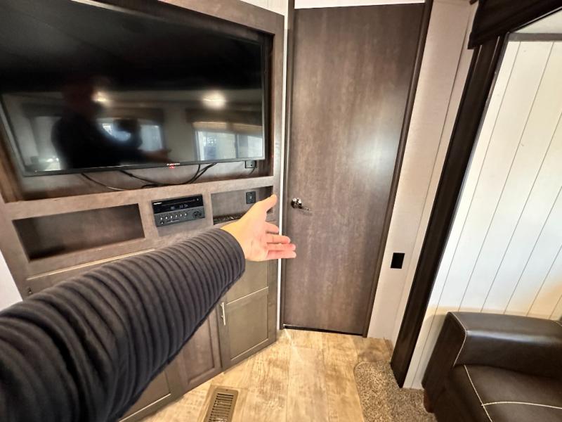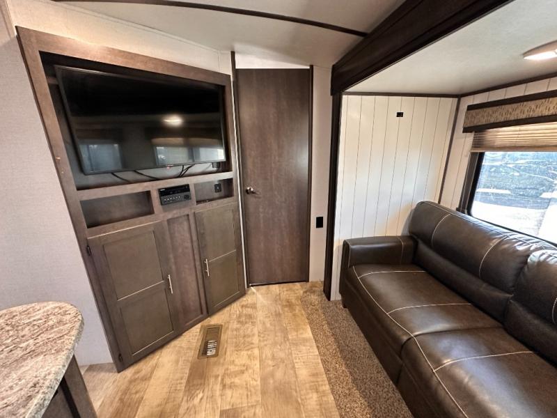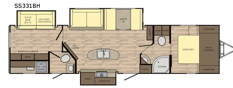 The rear of this Sunset Trail Super Lite provides a place that the kids are sure to appreciate. It is also a great space when spending time with camping guests. The private bunkhouse features a slide out jack-knife sofa with a 28" x 74" flip up bunk above along the road side. Opposite enjoy an entertainment center with storage, and another bunk above. There is a private half bath off the bunk room with its own private entry to the outside. Here you will find a toilet and vanity with sink.