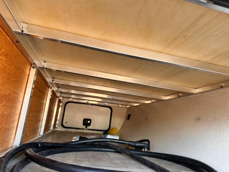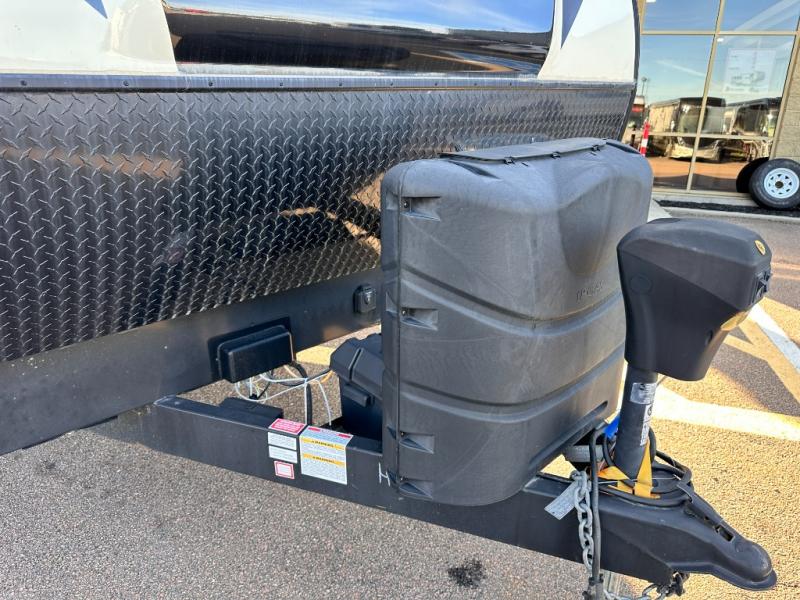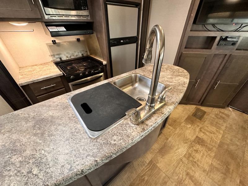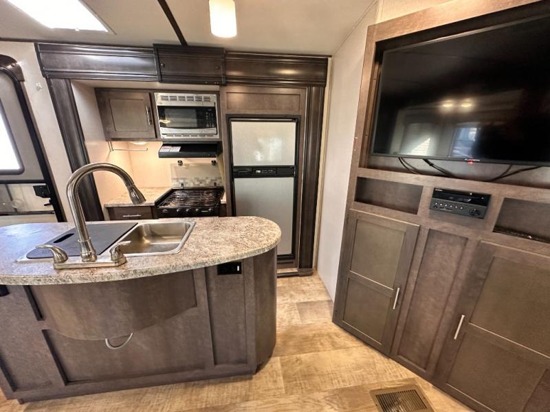 On the outside you will find a kitchen area beneath the curb side bunk. The exterior refrigerator allows you to keep drinks easily accessible, and there is also a single sink, plus so much more!