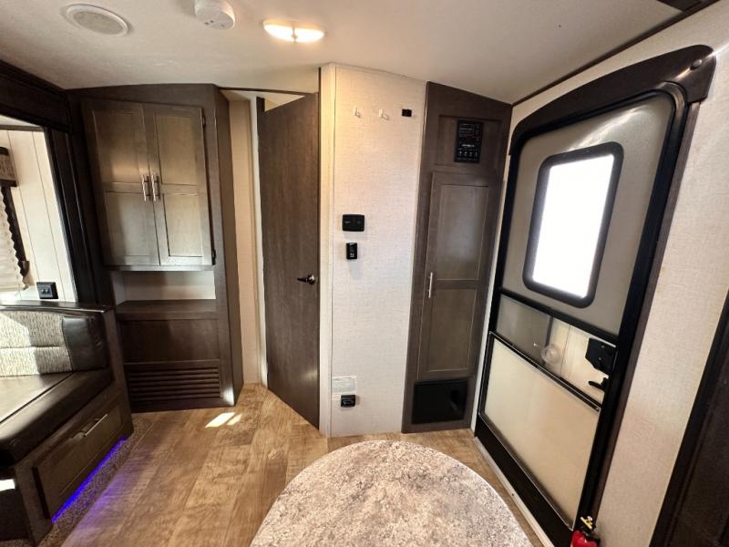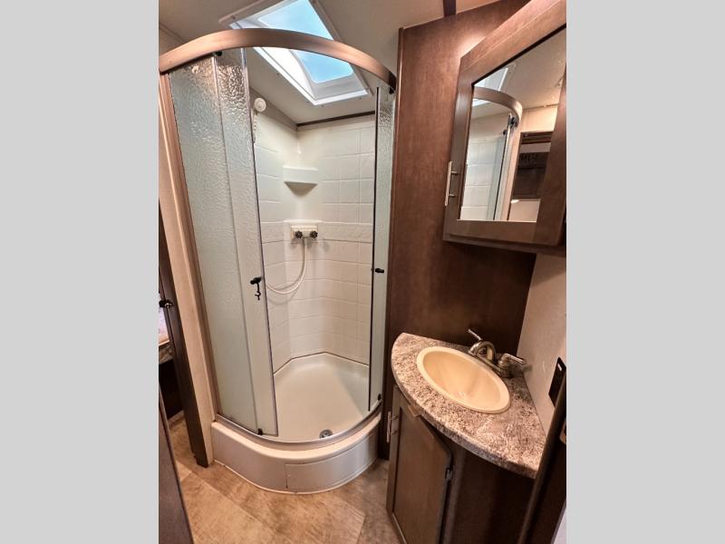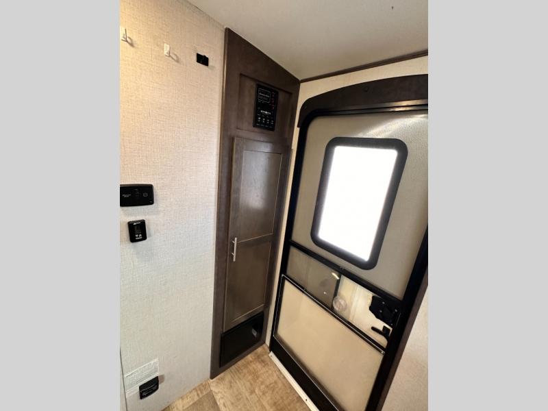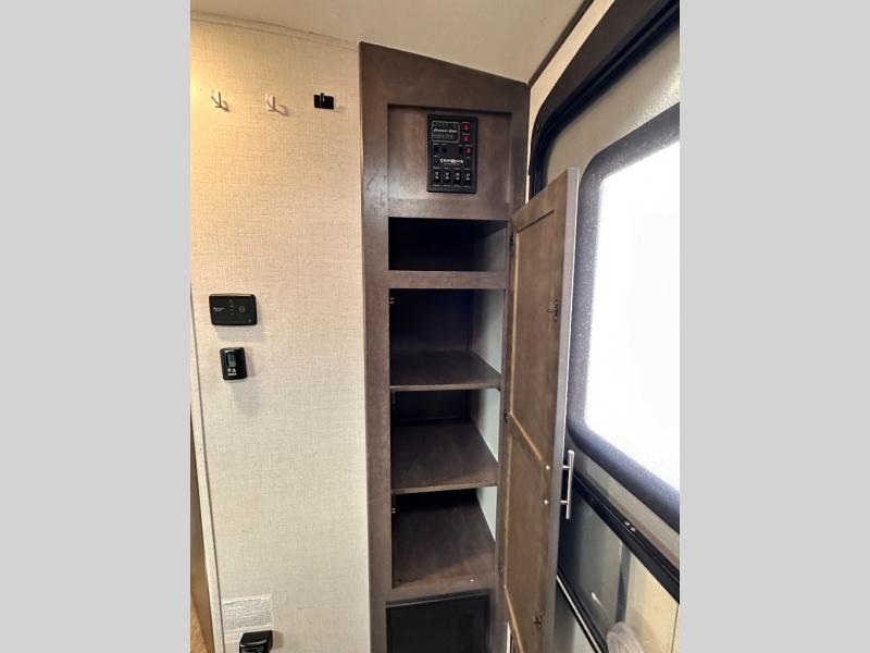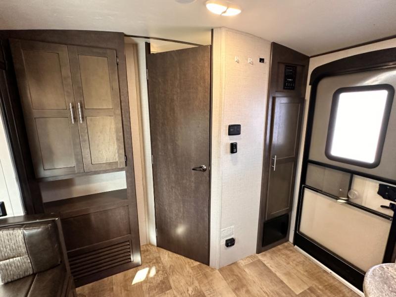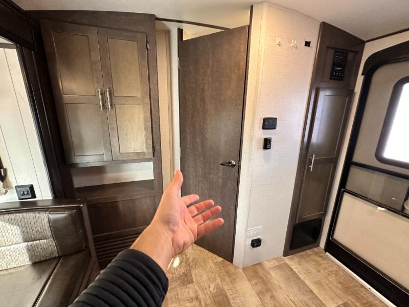 To the right of that same entry door you will find a handy closet for your coats and shoes. Around the corner toward the front there is a pantry just off the dinette slide, and the entrance into the walk-through complete bath which features a sink, corner shower, and toilet with linen/wardrobe storage above.