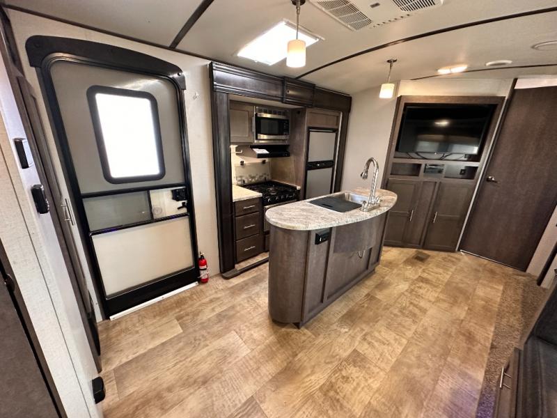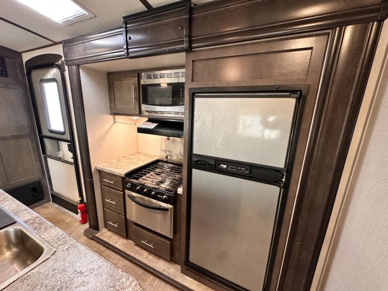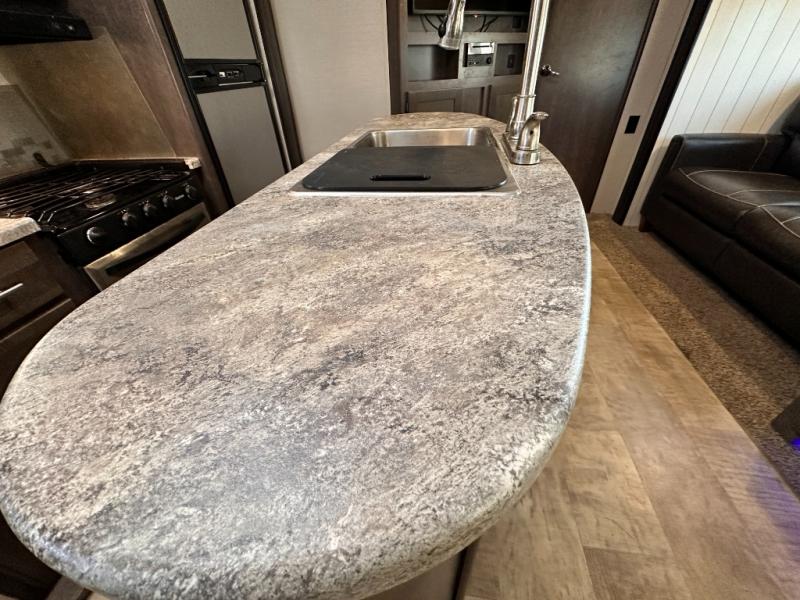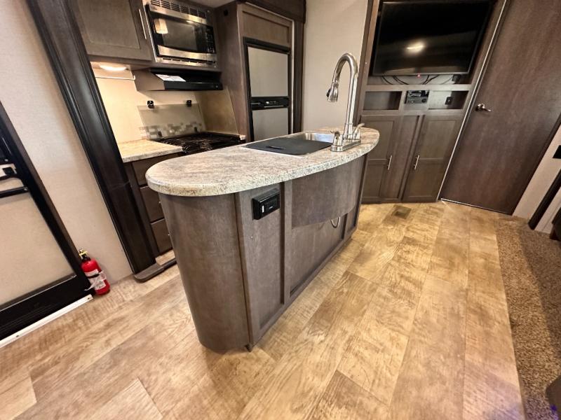 Step inside the entry door mid coach and find yourself in a spacious combined kitchen and living area featuring dual opposing slide outs. The slide to your immediate left offers a three burner range with overhead microwave oven, and a refrigerator, plus storage. There is an off center island featuring storage, plus counter space, and a double sink.