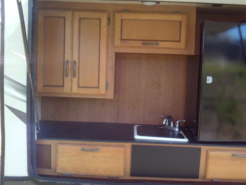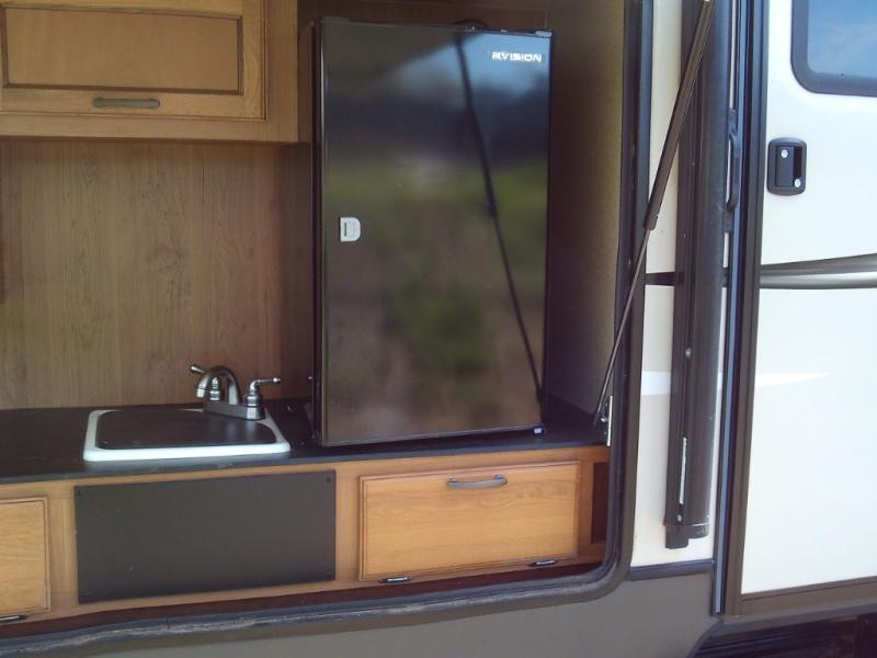 Head outdoors and find exterior storage for all of your gear, plus the outside kitchen which features a refrigerator, single sink, overhead cabinets, and work space. All this and more makes it easy to camp with your whole family and even a few friends!