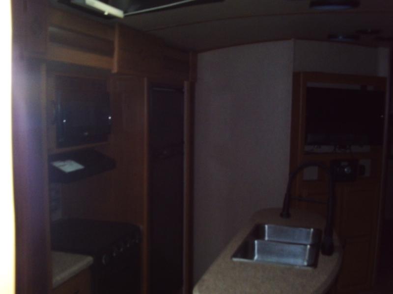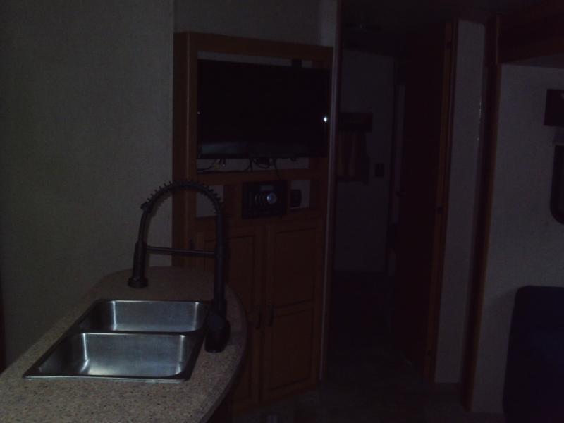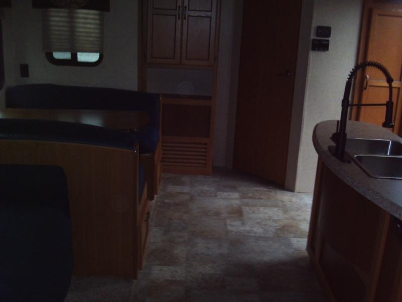 As you enter the living and kitchen area notice the amount of floor space gained once the large slide out sofa and booth dinette are fully extended. Here you will find seating for everyone for meals, television watching, or just hanging out. The entertainment center is along the interior wall facing the slide out for easy viewing.