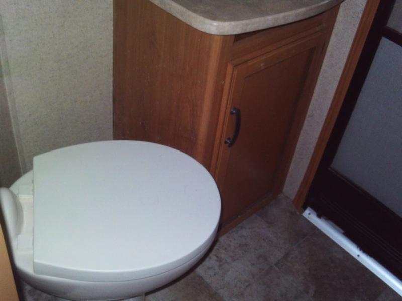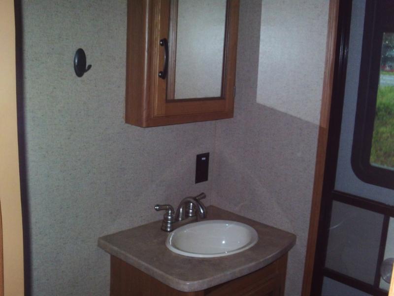 The rear of this Sunset Trail Super Lite features a private bunkhouse where the kids or extra guests will feel like they have their own little private space. There is a slide out sofa on the road side with a bunk above to provide a little hang out space during the day. There is another bunk on the opposite side above an entertainment center. The convenient half bath has access through the bunkhouse as well as from outside.