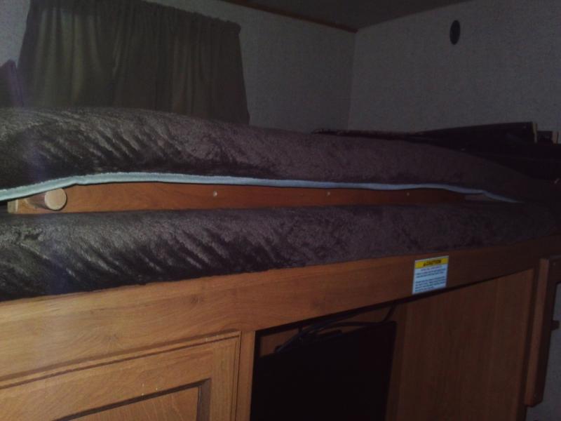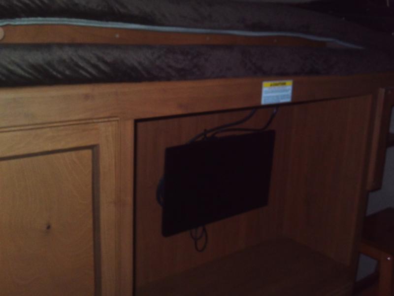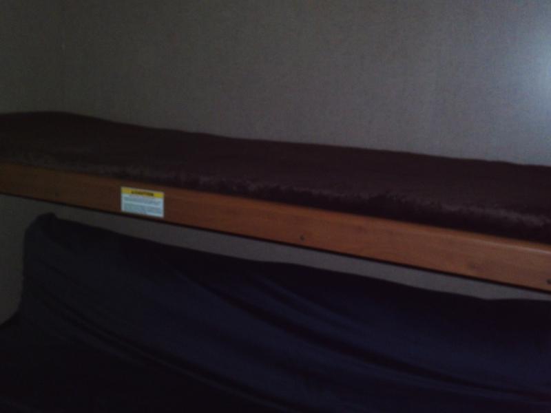 As you continue to the front master bedroom through the sliding door there is a queen size bed with shirt closets on either side, plus overhead cabinets for more gear.