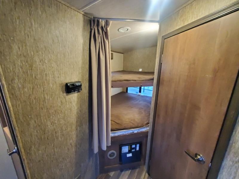 Your kiddos and guests will enjoy the rear double size bunk beds that are next to the bath. The bath features a tub/shower, toilet, corner sink, and a second entry along the road side wall of the trailer from the outside for added convenience.