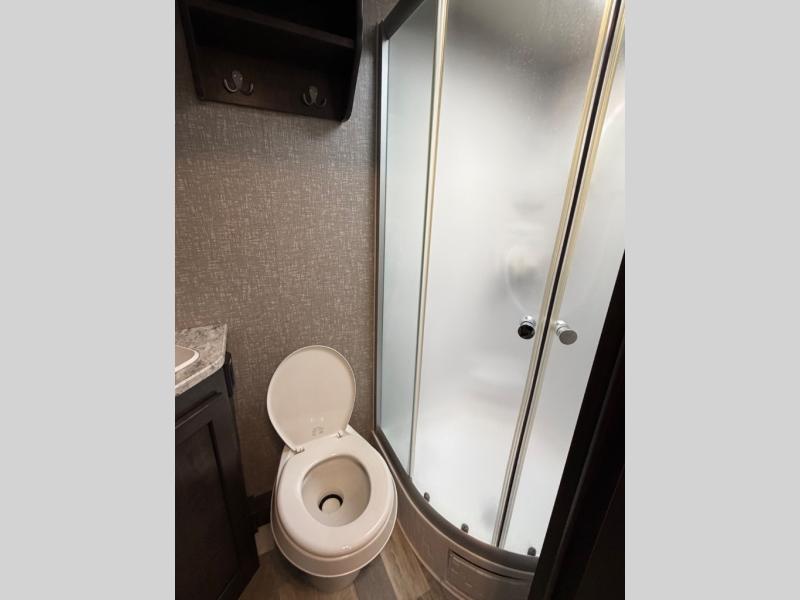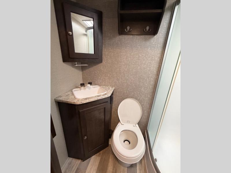 The rear of this unit features a full bath with toilet, sink, medicine cabinet, and radius shower. Plus there is a large wardrobe for linens and things, and more!