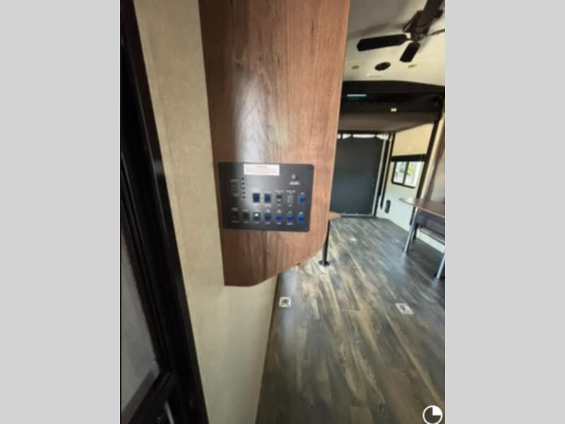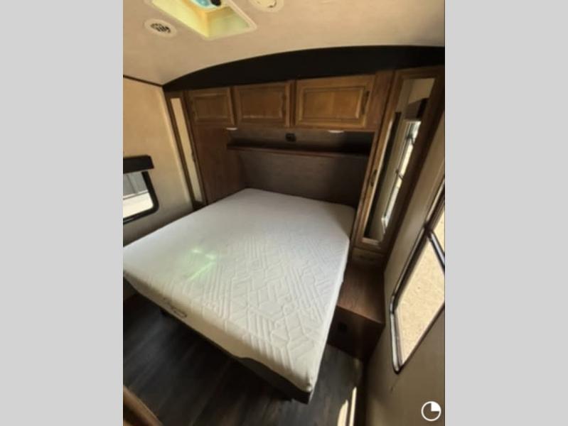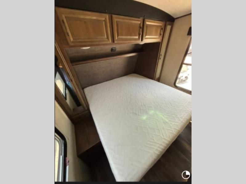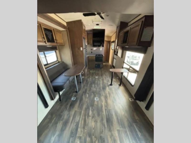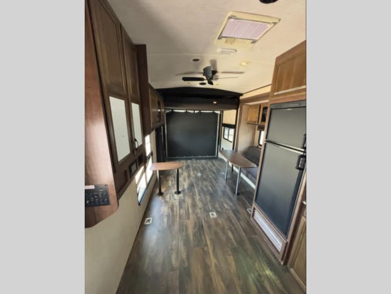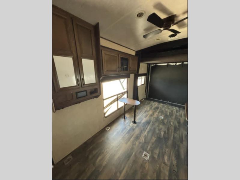 Above the rear sofas there is an electric bed which neatly stores near the ceiling when not in use. A sofa with an overhead cabinet and a table are located within the road side slide out, and two swivel rockers along the door side make for comfortable seating when you just want to kick back and reminisce about the days adventure. There are also plenty of overhead cabinets throughout the unit to keep things tucked away and organized.