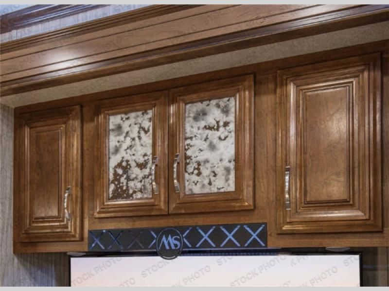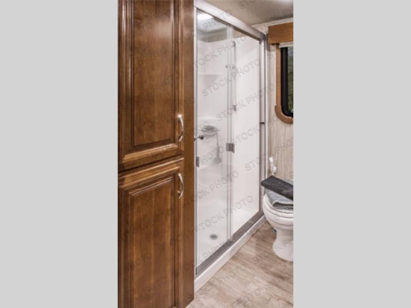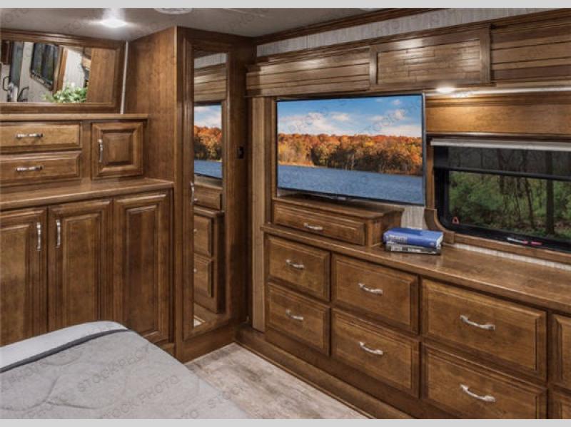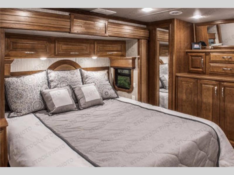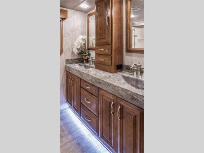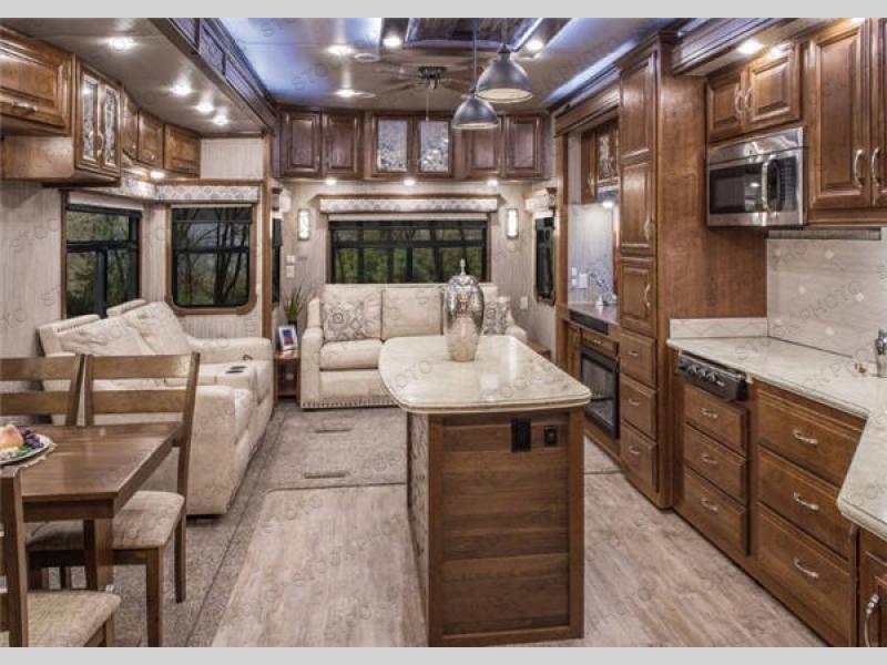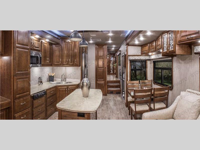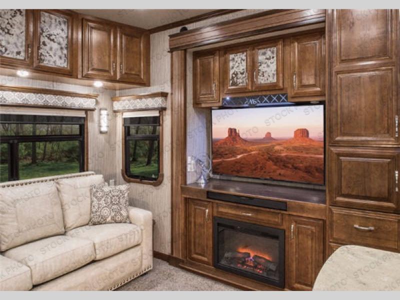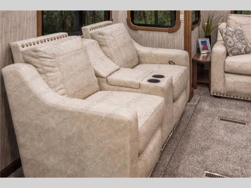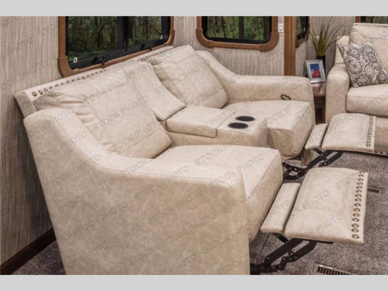 Step inside and notice the openness with dual opposing slides in this area alone. There is a slide out free standing dinette and a 65" theatre seat for two along the curb side. Adjacent, along the rear wall, there is a 75" sofa with overhead cabinets. The slide along the road side in this same area features an entertainment center with a 55" LED TV including a fireplace below. This can easily be viewed from any seating in the room.