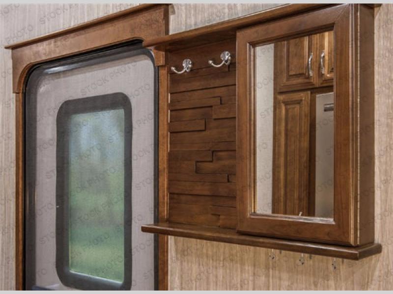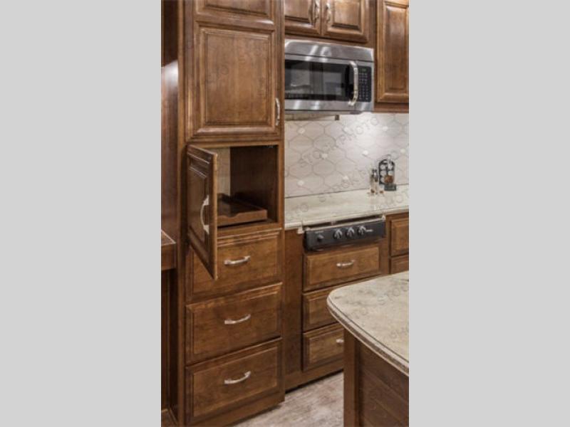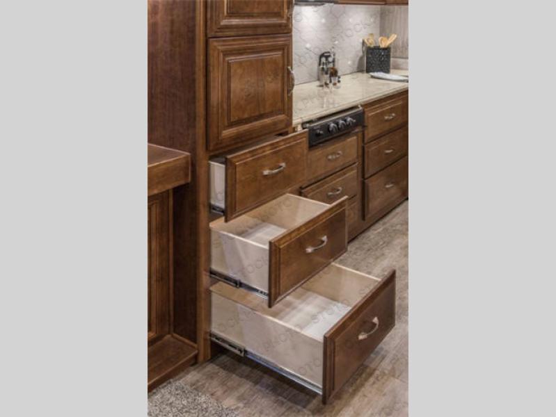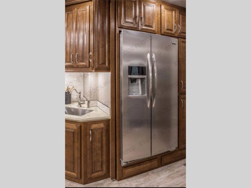 The remainder of the road side living area slide features the kitchen amenities. There is a storage cabinet, a Furion range base and convection oven above, plus a three burner range top. At an angle, along this slide, there is a large sink for cleaning up, and the residential refrigerator and pantry are just off this slide which you will see straight in through the main entry door. For food prep and serving you will love the convenient center island.