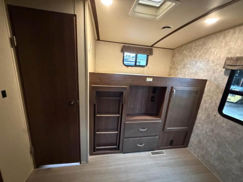 2 BATHROOM W/ BUNK ROOMThe dual entry Dutchmen Aerolite 319BHSS travel trailer features a rear bunkhouse including a sofa slide out with a bunk above. The private bunkhouse also features a 40" x 74" bunk and ladder with linen storage, wardrobe, and a TV mount below. A half bath with a toilet and a vanity sink with medicine cabinet is part of the private bunkhouse area, plus features an outside entrance/exit door.