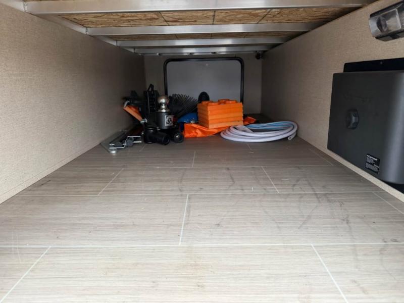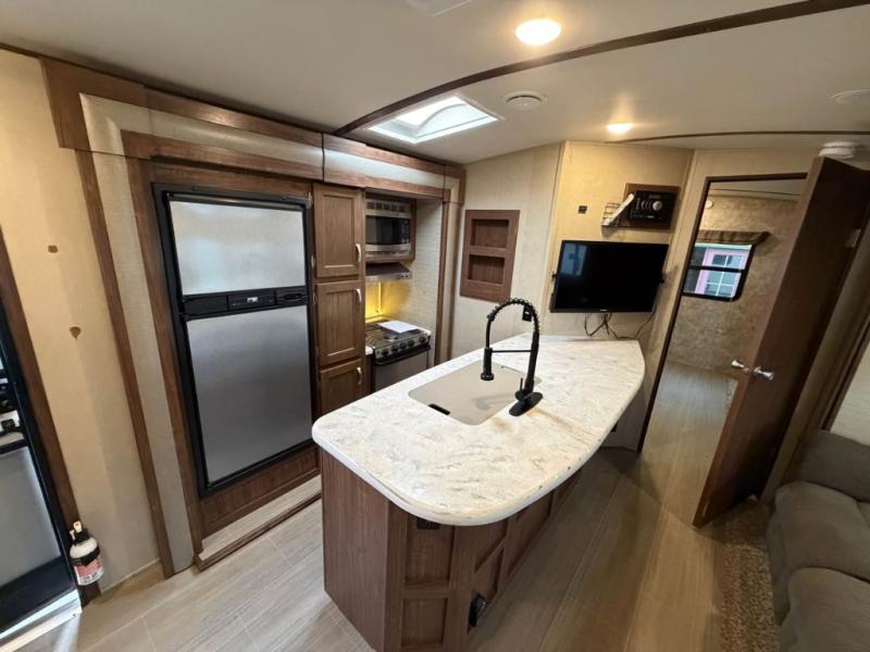 The Aerolite 319BHSS also offers an outside kitchen with countertop space, a double burner range, a 3 cubic foot refrigerator, and a TV mount. Near the front of the travel trailer you will find pass through storage for your outdoor gear.