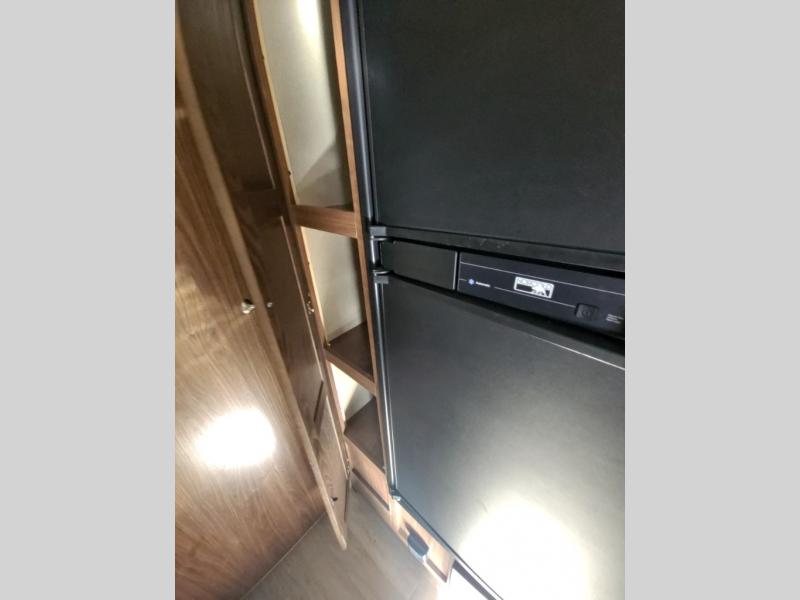 Step inside model 235QB and notice the sofa straight ahead with overhead cabinets along the road side wall. The sofa divides the space and separates the living area from the front master bedroom where you will find a queen size bed with dual nightstands and shirt closets, plus an overhead shelf for additional storage.