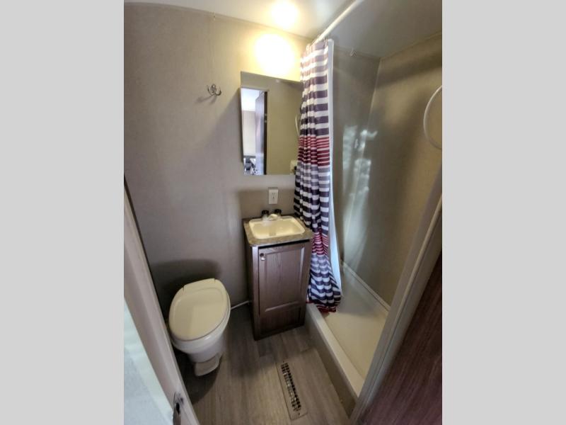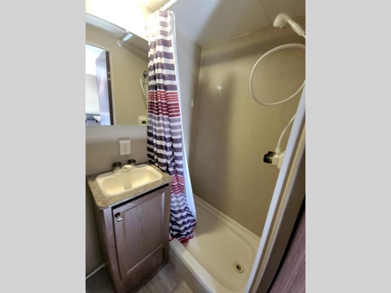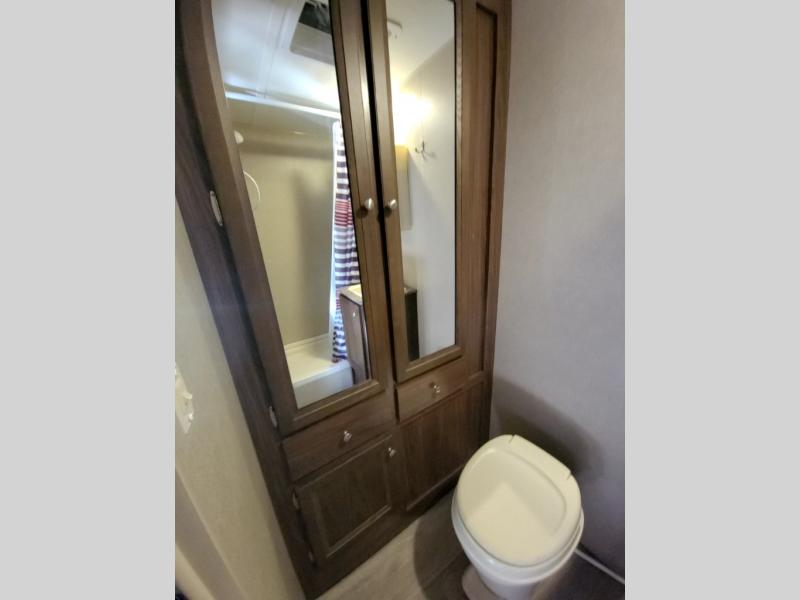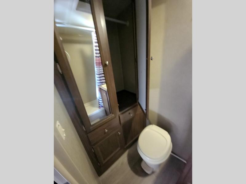 In the rear of this trailer there is a complete bath with shower, toilet, and sink including overhead storage, plus a wardrobe with drawers.