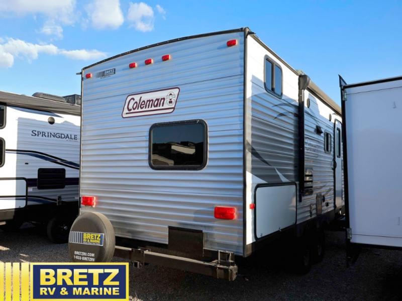 This Coleman Lantern Series travel trailer 244BH by Dutchmen features a set up double size bunk beds, a rear bath, an outside kitchen, front bedroom, and a u-shaped dinette, plus more!