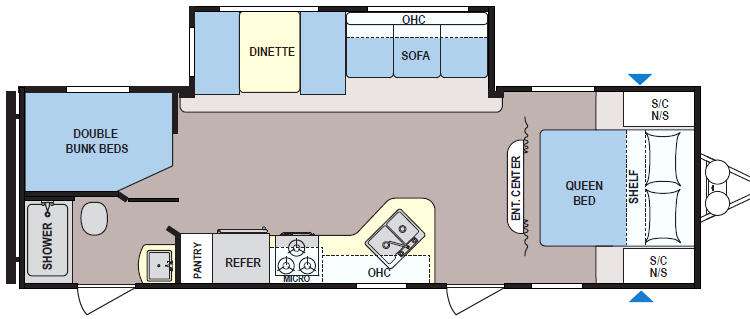 Step inside the main entry and find a master bedroom in front that features a queen size bed, dual bedside shirt closets and nightstands, plus an overhead shelf. The living room entertainment center sits just off the foot of the bed and provides curtains on either side for more bedroom privacy when pulled shut.