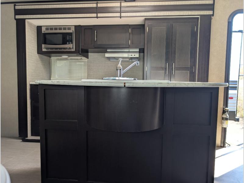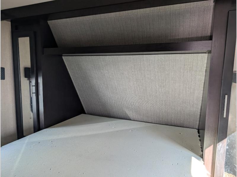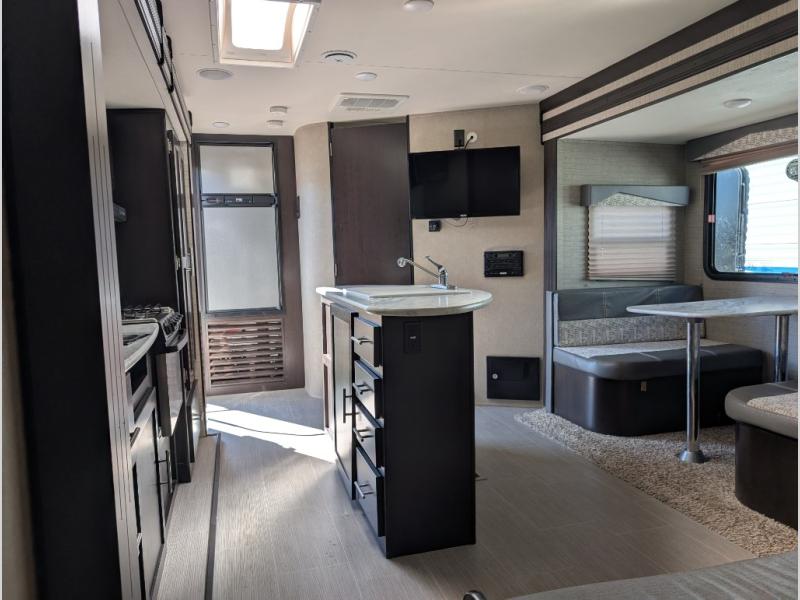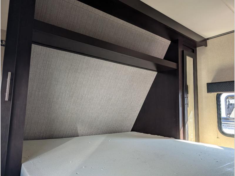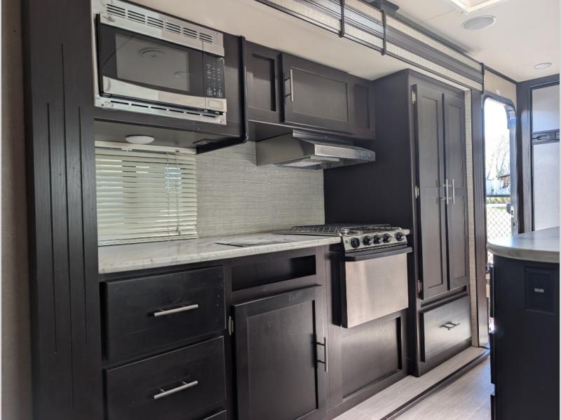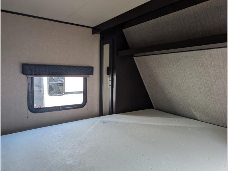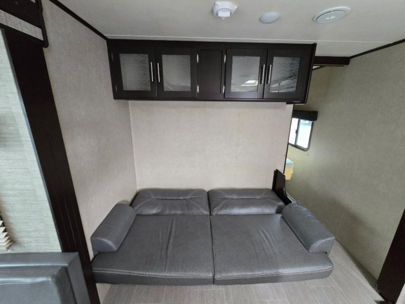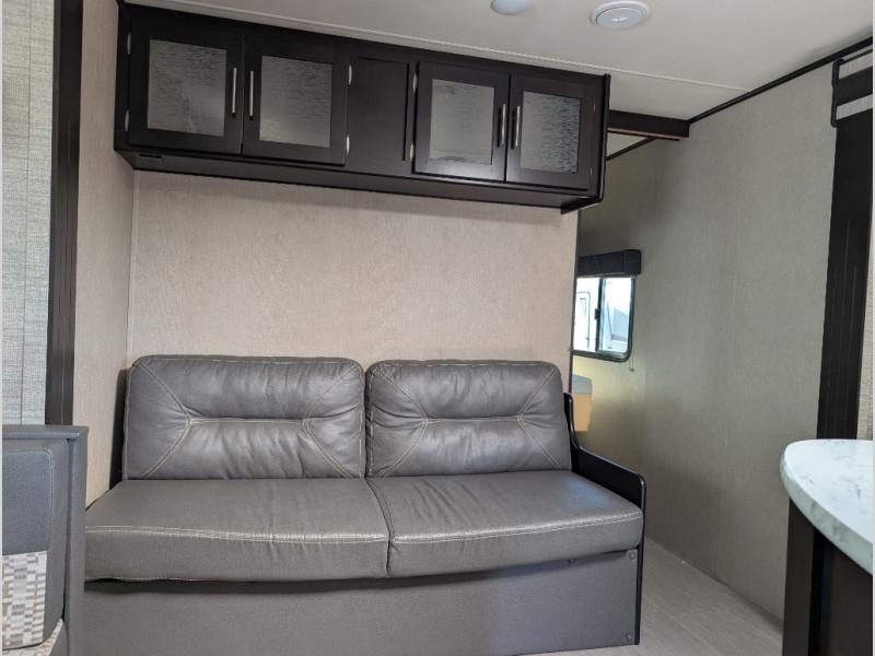 In the living area you will enjoy the added space thanks to dual opposing slides, with one slide out featuring a 40" x 74" booth dinette. There is a sofa adjacent that features overhead cabinets for your things, plus you can easily sleep two more people on either of these seating areas if needed.