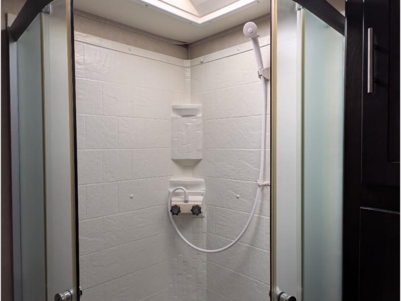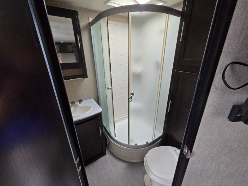 In the right rear corner of the trailer you will find the bathroom featuring a radius shower, toilet, plus vanity with sink and medicine cabinet. There is also an overhead linen cabinet above the toilet.
