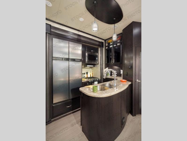 The kitchen features a slide out refrigerator, and a three burner range with microwave above. The counter peninsula features a double sink and overhead storage area. There is also a storage closet near the counter straight in from the main entry door.