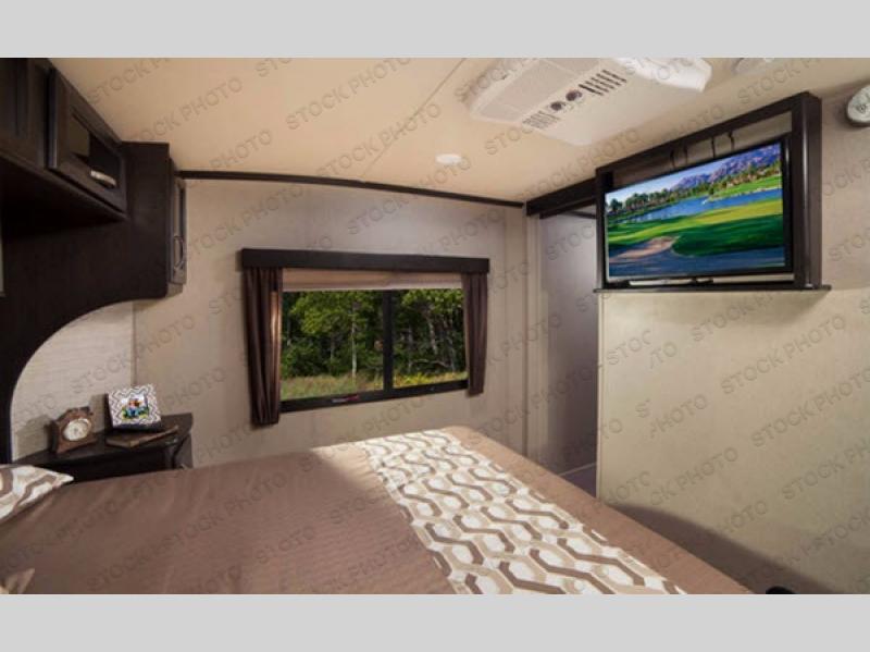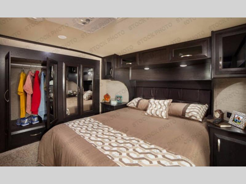 Continue down the hall to the front private bedroom with sliding pocket door. There is a queen bed with storage above and below including nightstands on both sides of the bed. You will also find a slide out double wardrobe, and a TV.