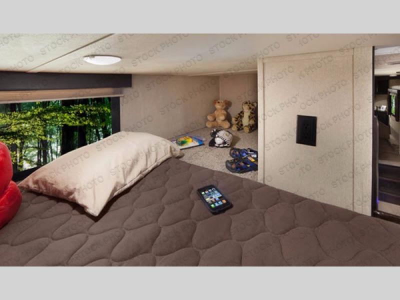The 8' zero gravity rear ramp door will make loading and unloading a breeze into the 11' cargo space provided. There is a 40" x 88" twin loft bed, and a TV overhead cabinet in the cargo, plus a convenient half bath as well. You can dine at the dual sofas with table top, and sleep on the lay flat Happy-jack power bunk in the rear. The side man door allows quick and easy access to your toys and the half bath.