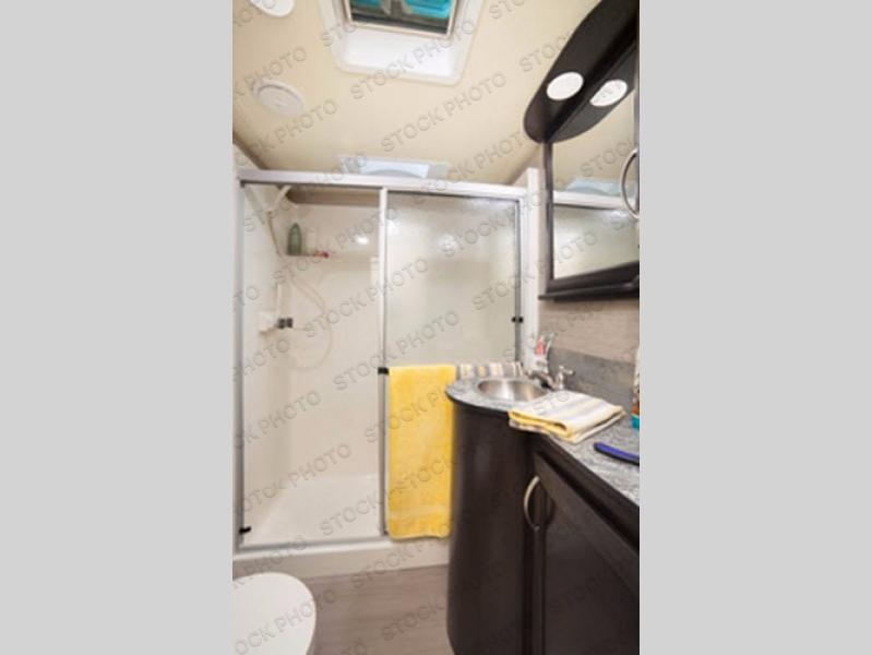 As you make your way into the main living area from the garage you will see a large sofa lounge slide out with a stowable table for dining along the curb side. There is TV with fireplace below on the outer half bath wall for easy viewing.