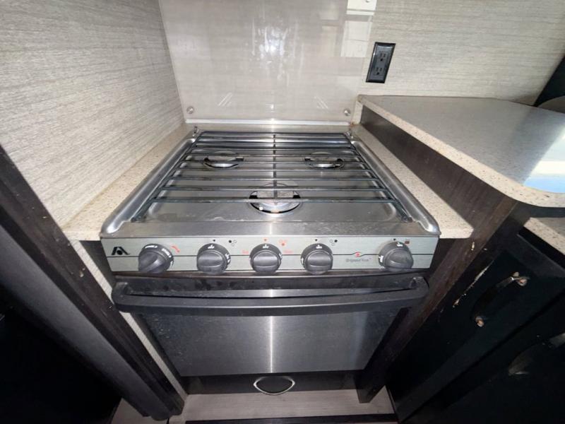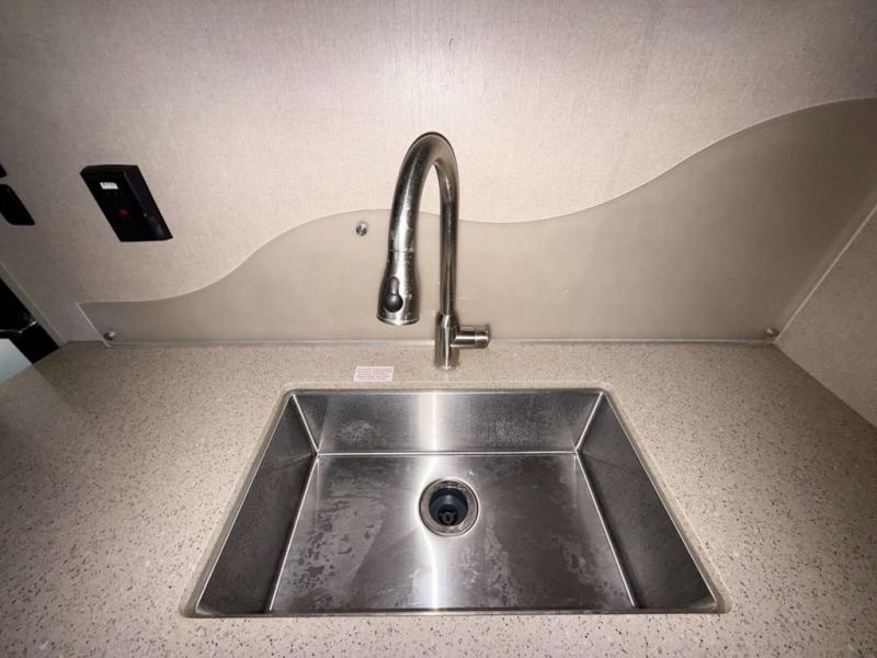 Step inside the kitchen from the cargo area. There is a large sink and countertop space to your left. Beyond the sink there is a slide out three burner range with microwave above, counter area and peninsula, plus an L-shaped lounge slide. Across, on the door side find a second slide out recliner sofa with stowable table, a refrigerator, and pantry for food storage needs.