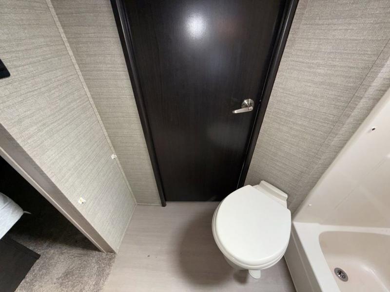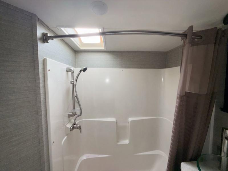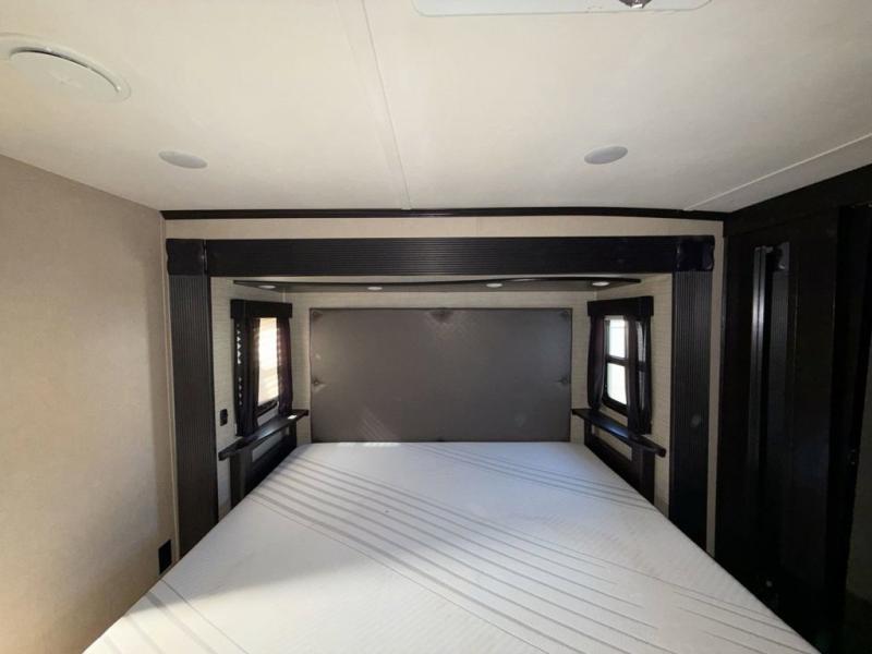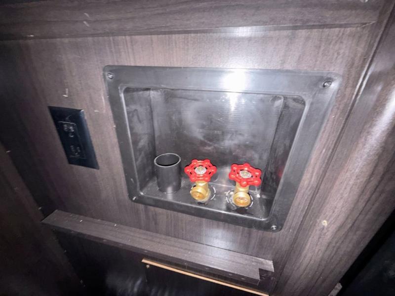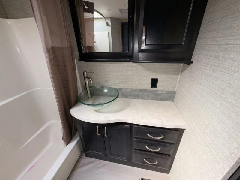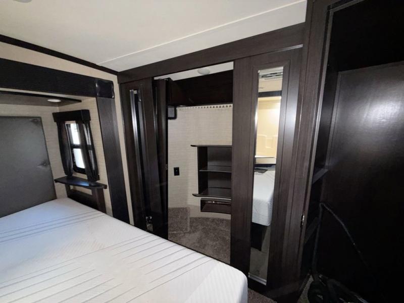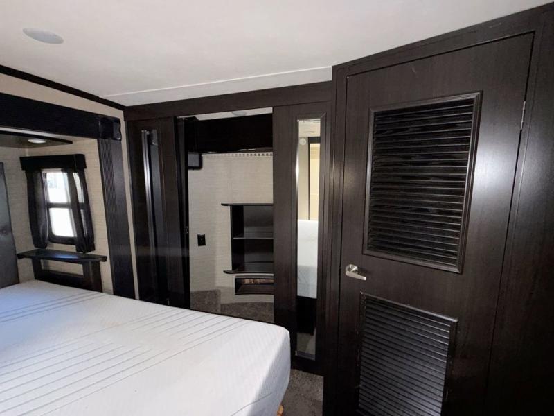 At the very front of this Voltage 3970 enjoy a spacious master suite with slide out king size bed including a dresser opposite with TV, and a front wardrobe for all of your clothing. You will also love that the closet has been prepped for a washer and dryer if you choose to add as well.