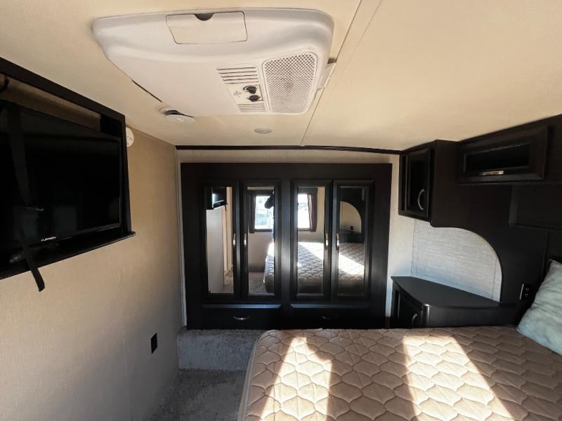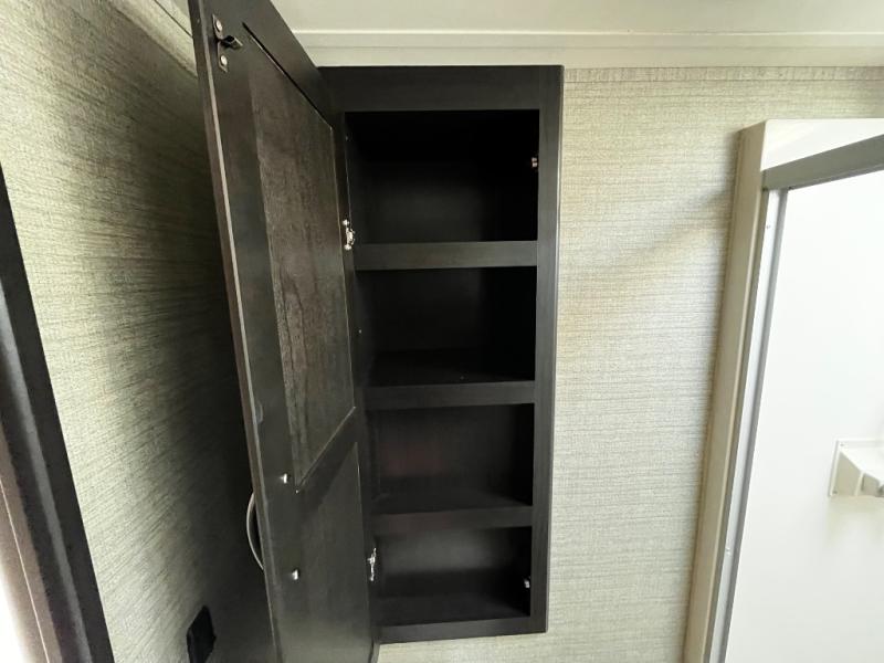 Continue down the hall to the front private bedroom with sliding pocket door. There is a queen bed with storage above and below including nightstands on both sides of the bed. You will also find a slide out double wardrobe, and a TV.