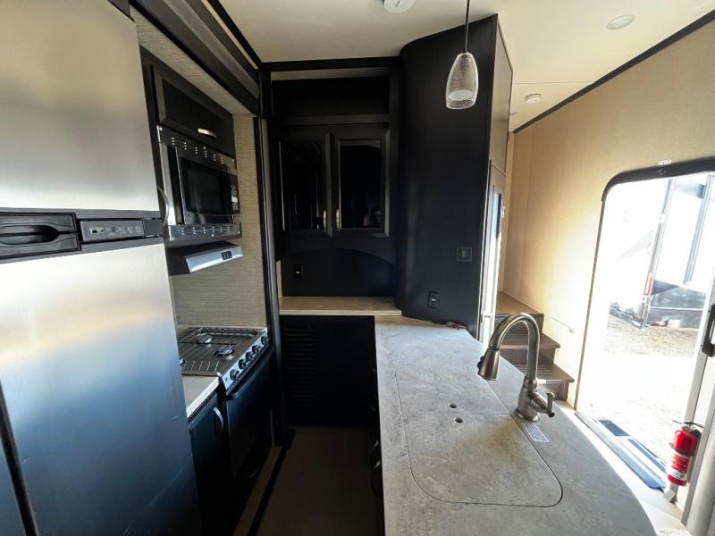 The kitchen features a slide out refrigerator, and a three burner range with microwave above. The counter peninsula features a double sink and overhead storage area. There is also a storage closet near the counter straight in from the main entry door.