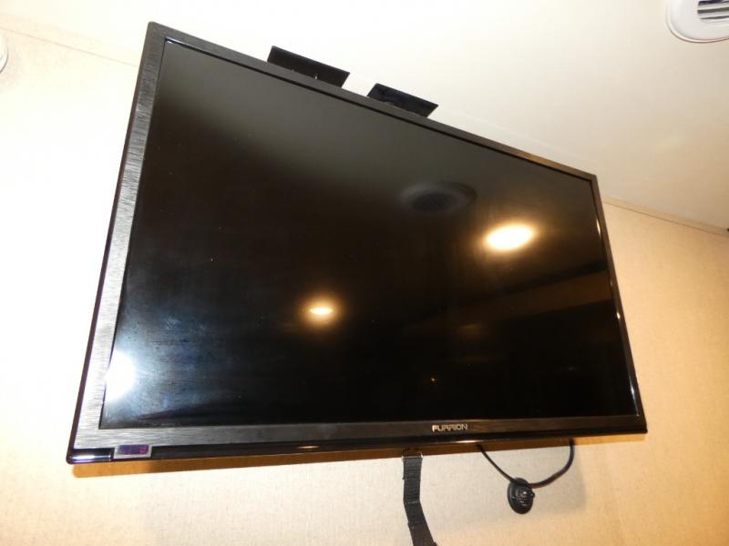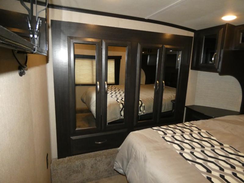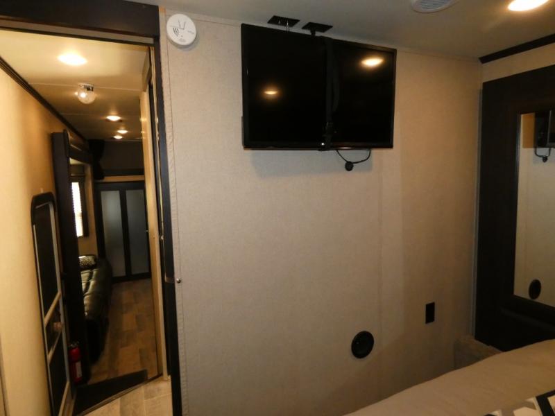 In the very front through a sliding door you will find a spacious retreat featuring a queen bed with storage above and below. There are nightstands on either side of the bed, a TV, plus a slide out double wardrobe too.
