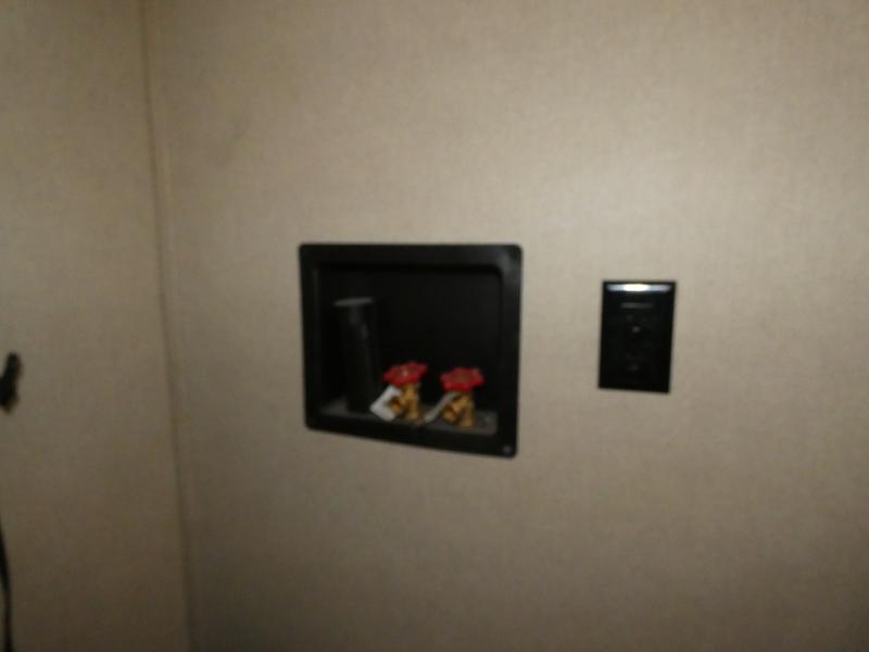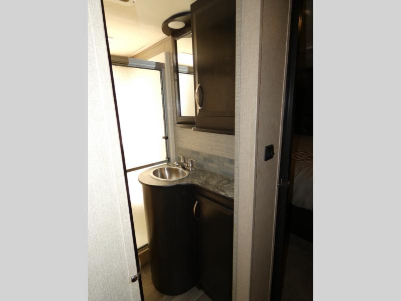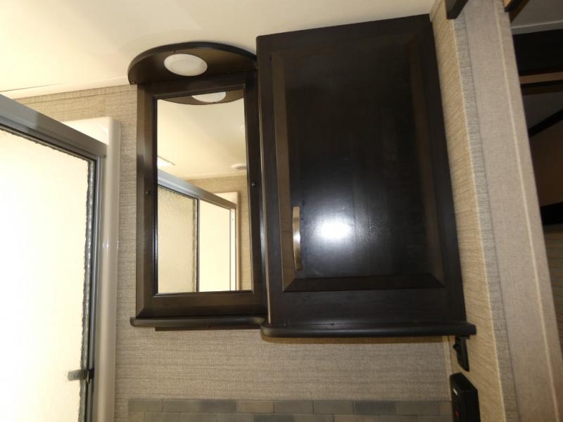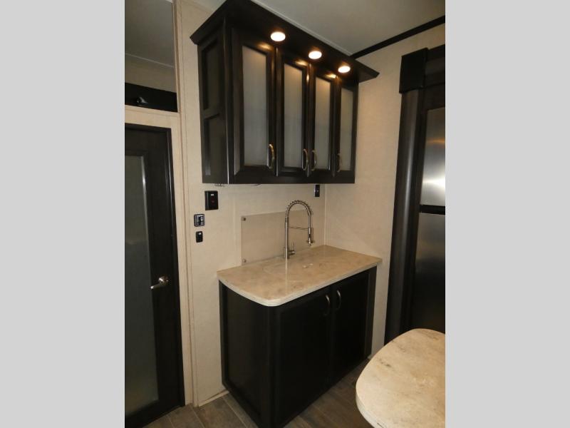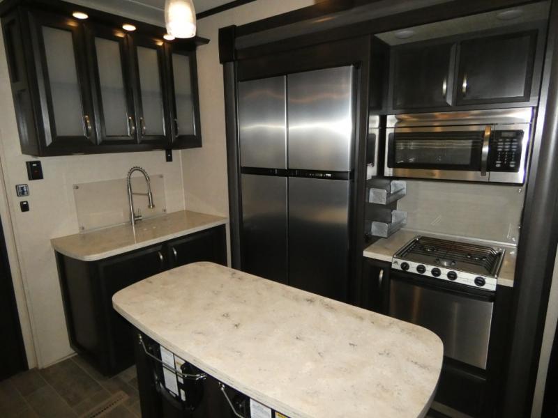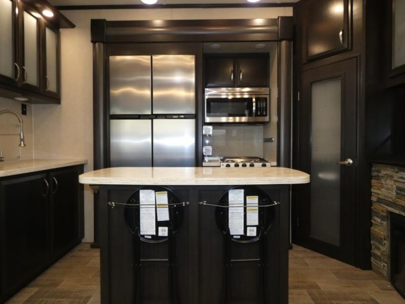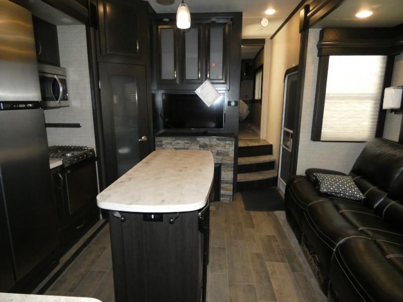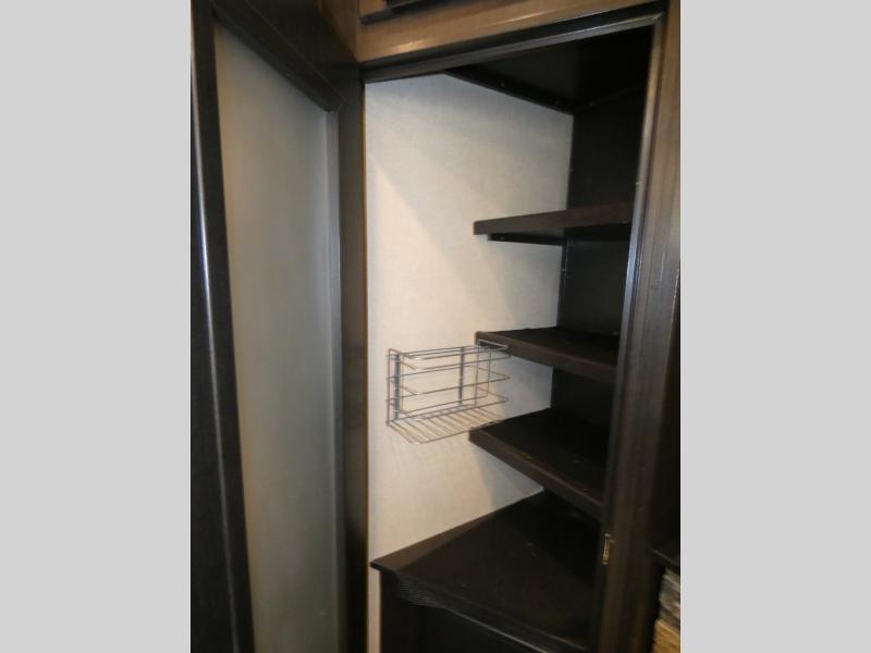 Once inside you will notice a wide open combined living space featuring the kitchen and living area complete with dual opposing slides. There is a slide out large sofa along the curb side wall with a stowable table. Straight in through the door, and along the interior wall, you will find an entertainment center with TV and fireplace. There is also a corner pantry along this wall as well.