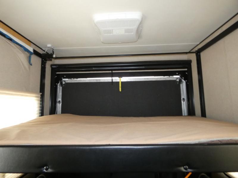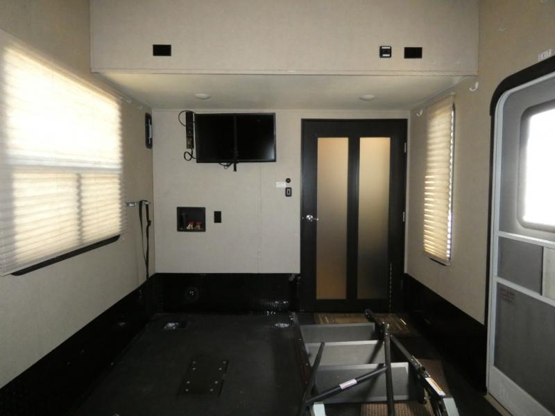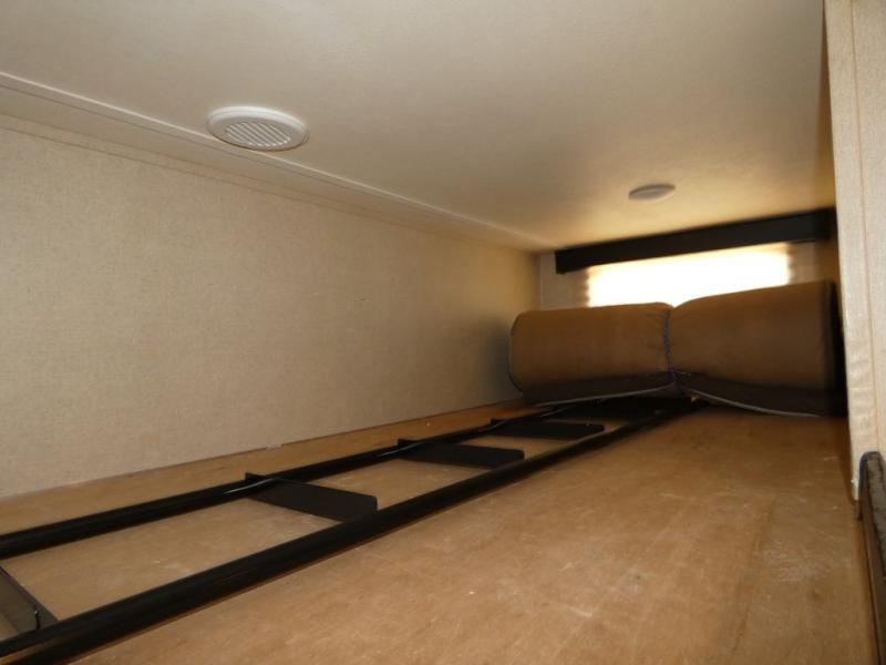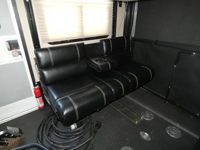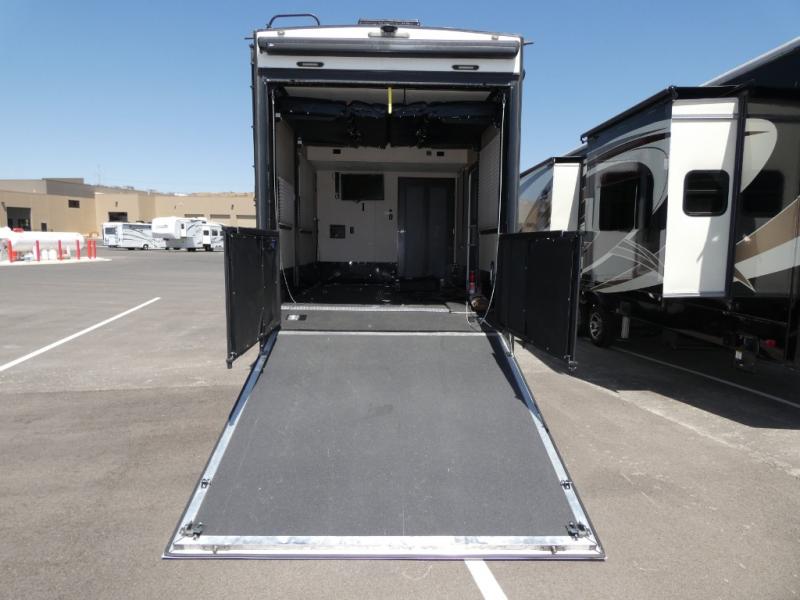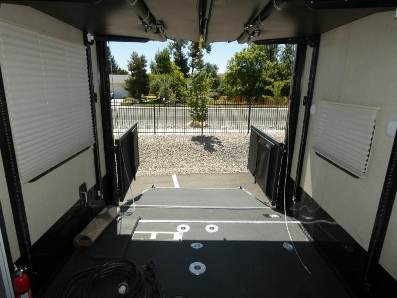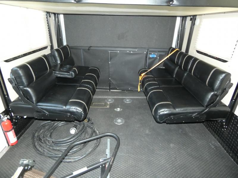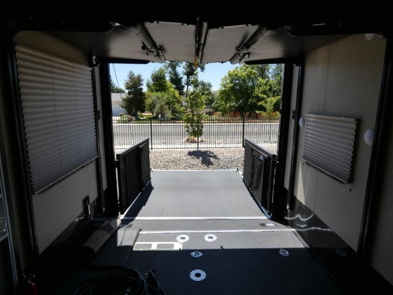 Model V3655 makes it easy to load and unload into the 12' 6" garage space using the 8' zero gravity ramp door. Inside you will find a lay flat Happy-jack power bunk with sofas below facing one another, and a table top between. There is also a twin bed loft in the front of this space that a few might be drawing straws for! Once your gear is secure and the rear ramp door is closed, you can easily access the cargo area using the side man door. From here there is entry into the main living space, or you can use the curb side entrance door closer to the front.
