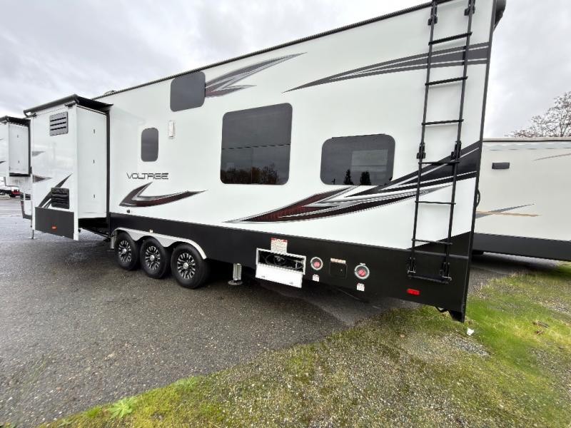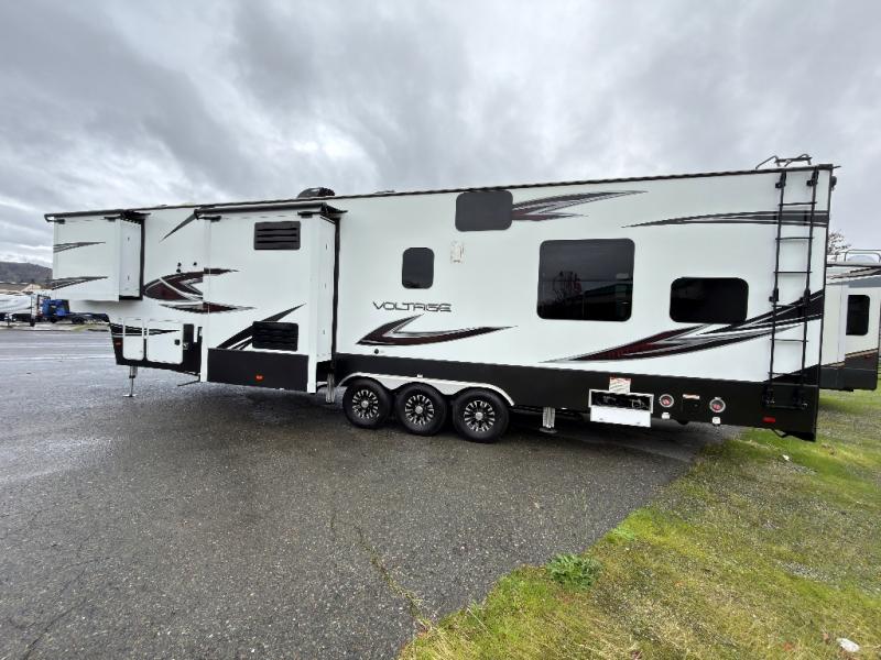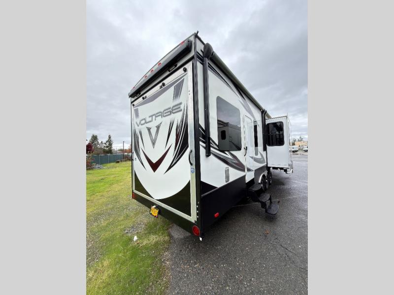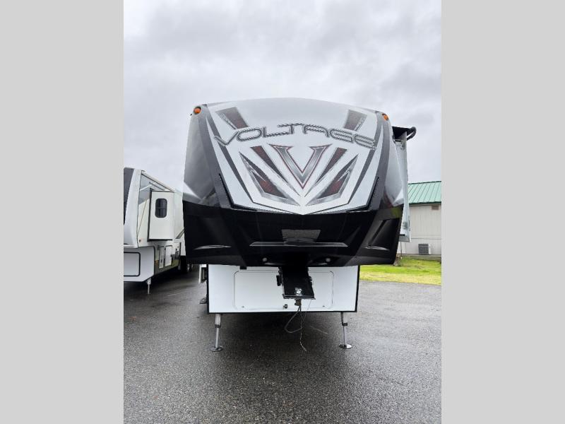 Enter this Dutchmen Voltage fifth wheel toy hauler and see that you can easily have fun inside, as well as outside with the toys you bring along. Model V3805 offers a 14' garage space, triple slides, and one and a half baths, plus much more!