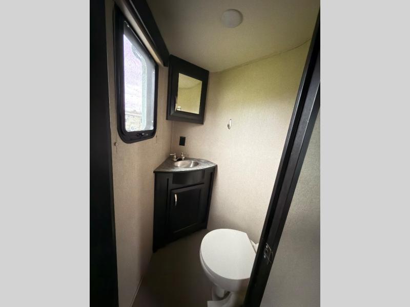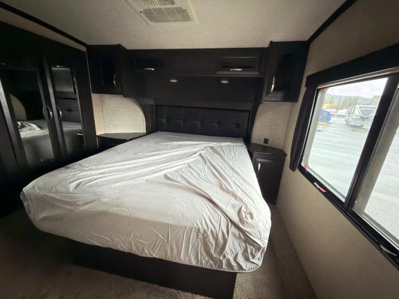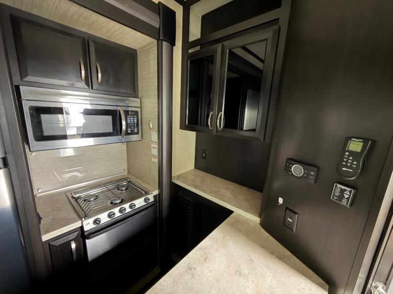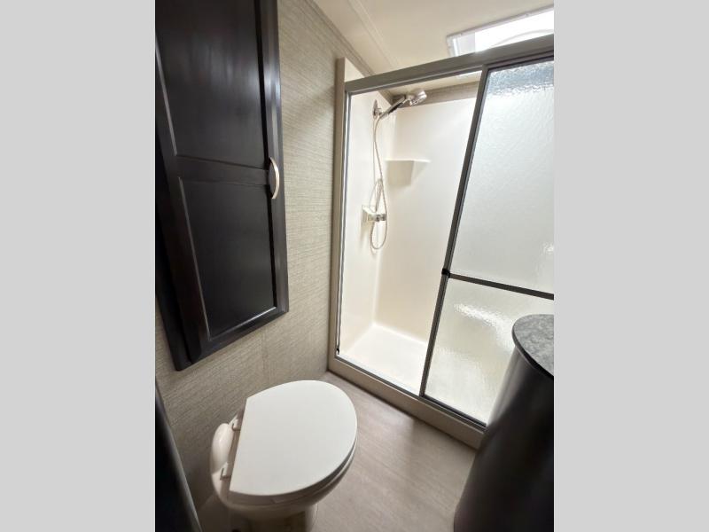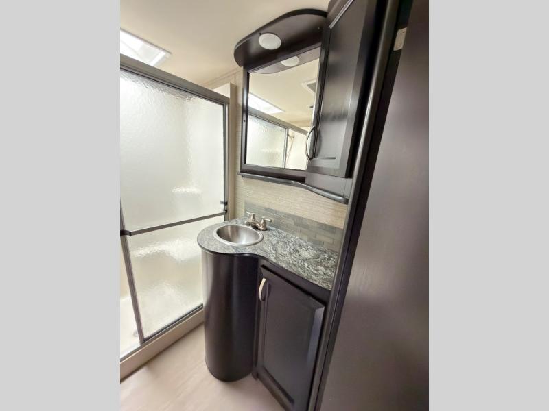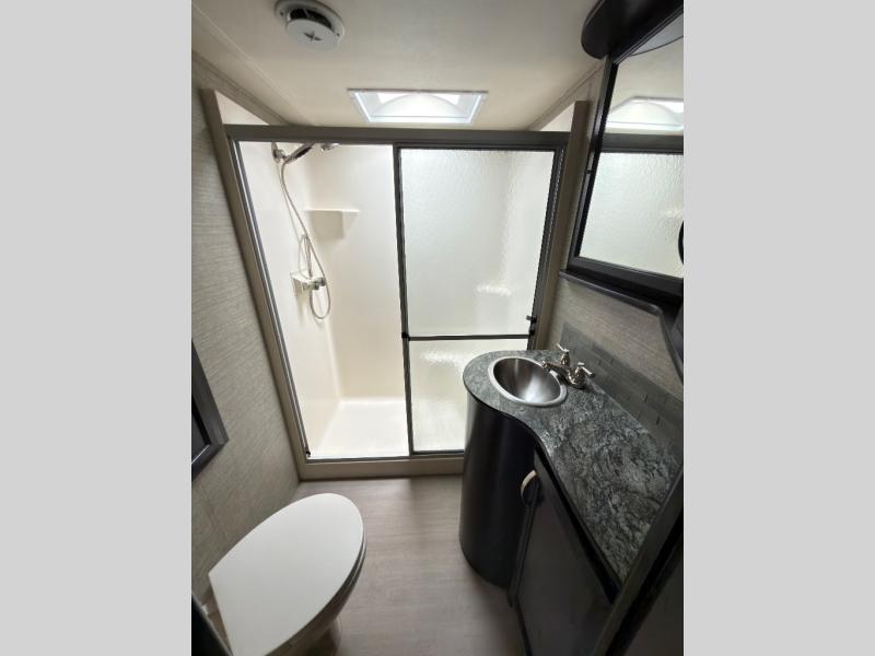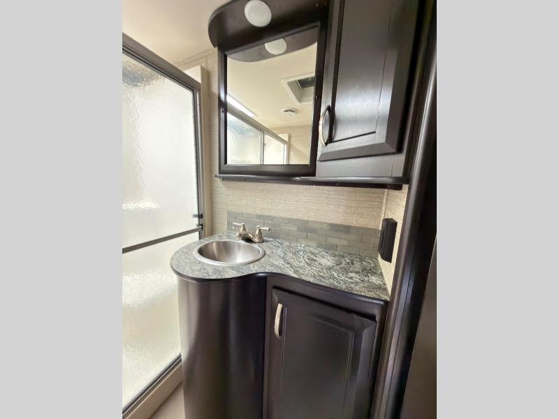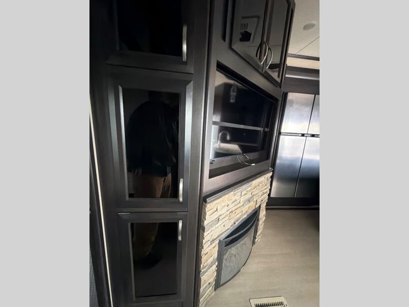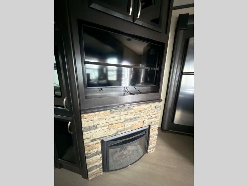 In the living area find a large slide out sofa seating area with stowable table which can easily view a TV located across the room on the angled 1/2 bath outer wall. There is also a fireplace below that makes it feel a lot like home.