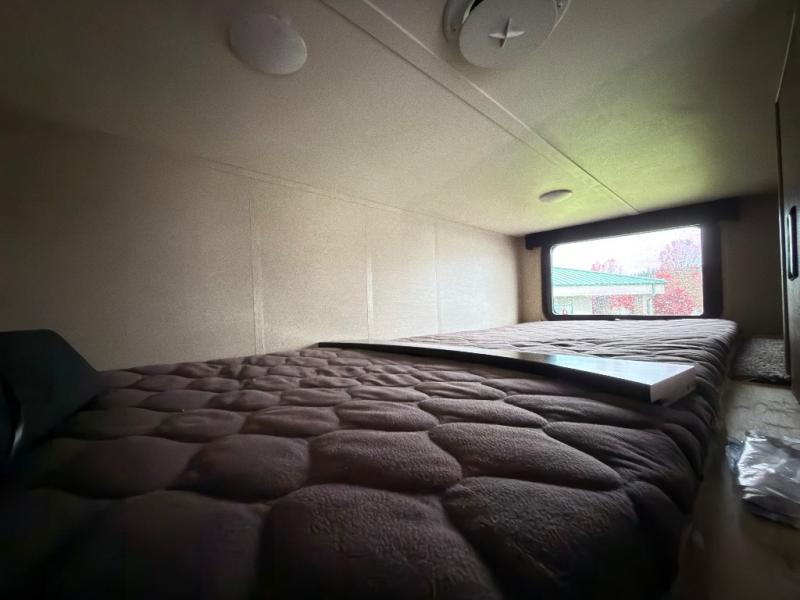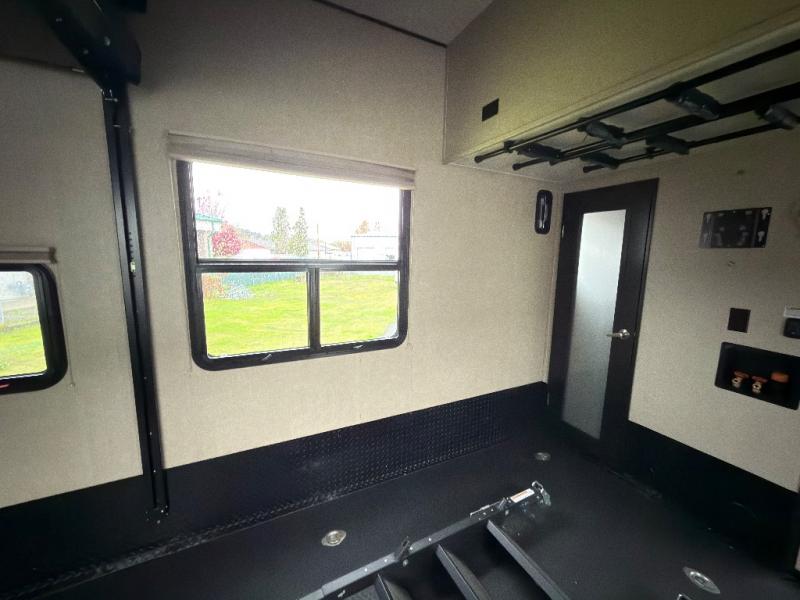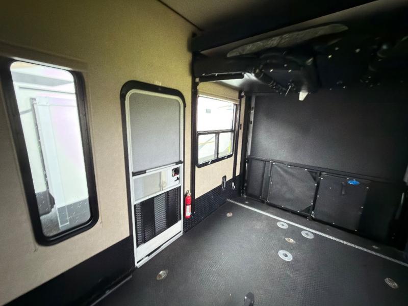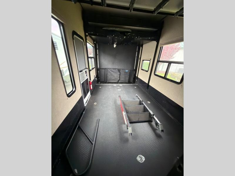 The rear 8' zero gravity ramp door makes loading and unloading a snap and there is plenty of room for all of your toys. The cargo area features tie downs to secure things as you travel, and once you've arrive you have added space to enjoy. In the rear you will find a lay flat Happy-jack power bunk with sofas and a table top below, plus a TV. There is a 40" X 88" twin loft, plus a half bath off the cargo area for added convenience which includes a toilet and sink with overhead cabinet.
