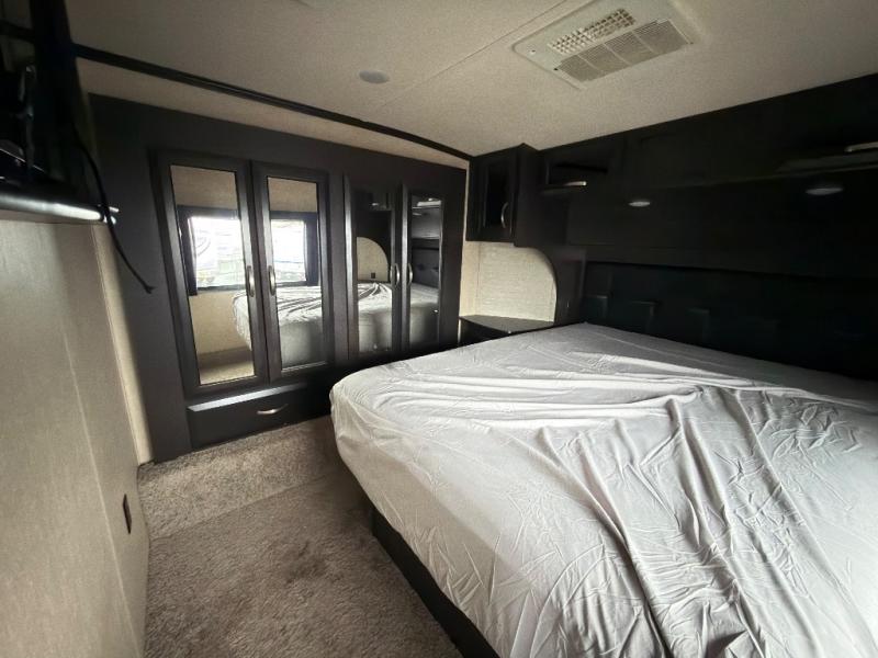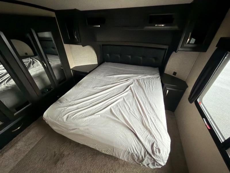 Continue down the hall to the sliding door that leads into the front bedroom featuring a queen bed with storage beneath. There are dual nightstands and a dual wardrobe slide out for added storage, plus a TV and overhead cabinets too.