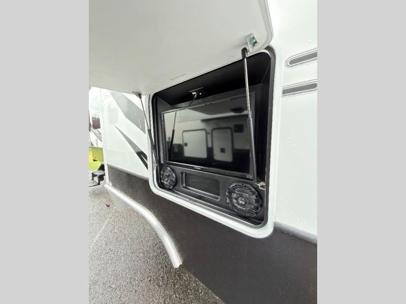 On the outside of this Voltage toy hauler enjoy a gasoline pump station, front pass-through storage, a ramp door patio with entry steps and awning option, and an optional outside entertainment center located beneath the 18' awning area on the outside of the large sofa slide.