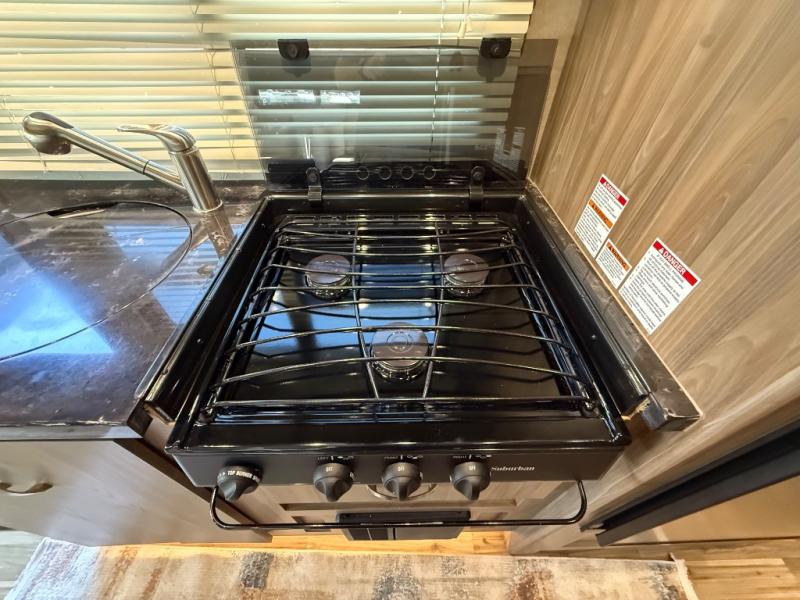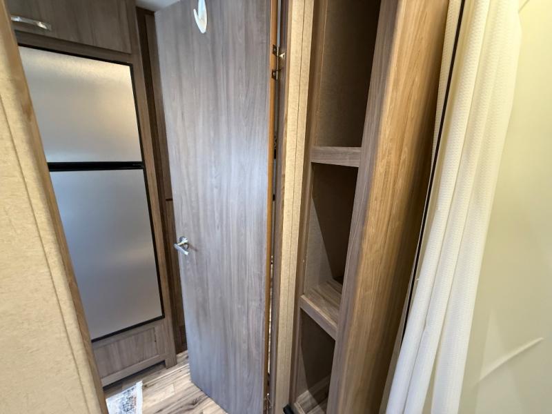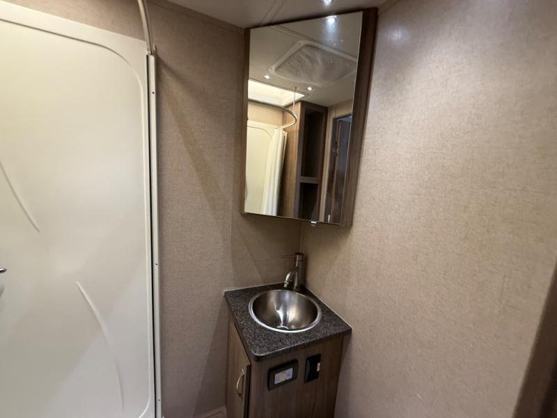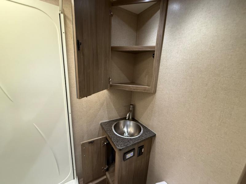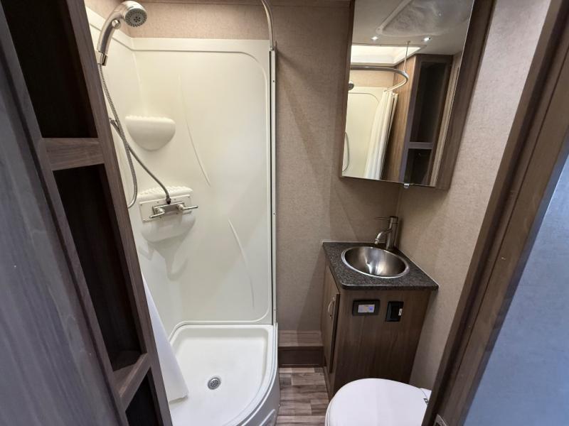 A complete bath makes this a perfect get-a-way home on wheels with a corner shower, toilet, and vanity with sink, plus overhead cabinet, and so much more!