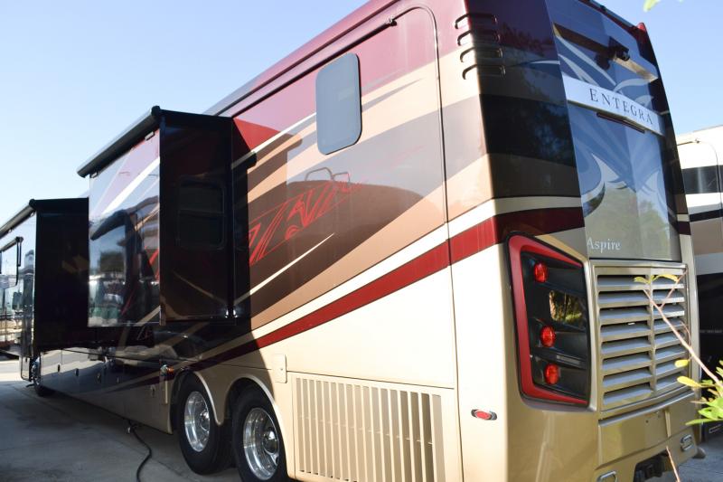 This Entegra Coach Aspire 44B class A diesel motor home offers quad slides, a rear master bath and half bath, a desk, plus much much more!