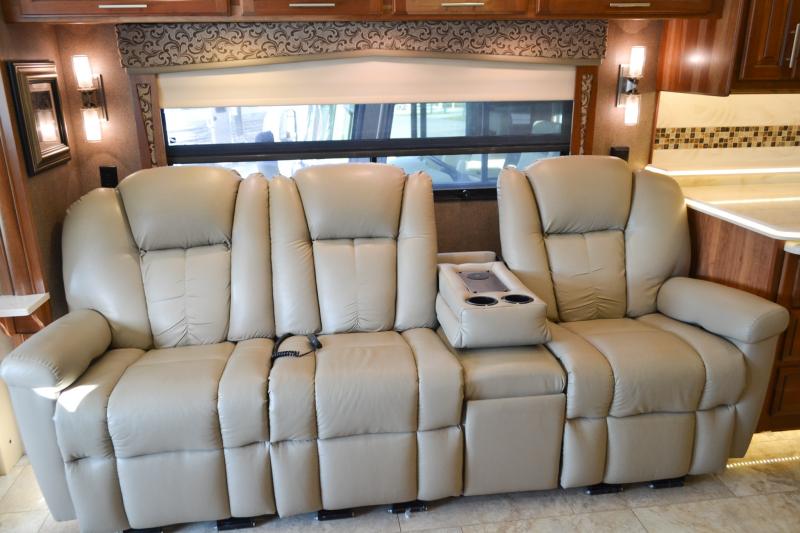 On the passenger side of the motor home you will find a slide with an expandable sofa or you can choose an optional sofa, double kitchen sink, two burner range, and a microwave. On the opposite side there is an entertainment center with fireplace option, and a 50" LED TV, dinette with chairs, desk, plus a refrigerator. Just past the slide you will find a half bath for family and guests.