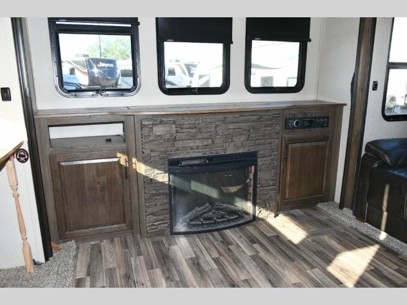 Entertainment Ready: The rear lounge design centers around comfort, featuring multiple seating options and a built-in fireplace that enhances the cozy ambiance.