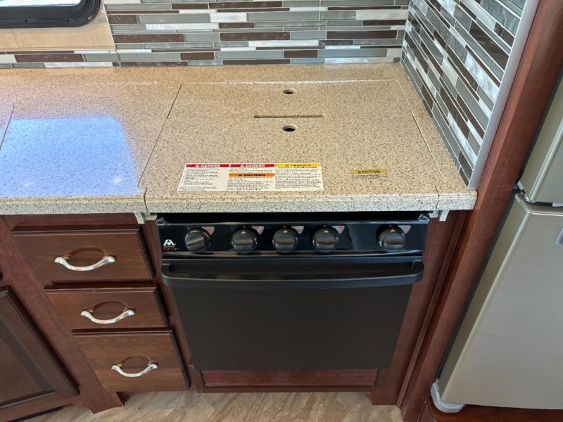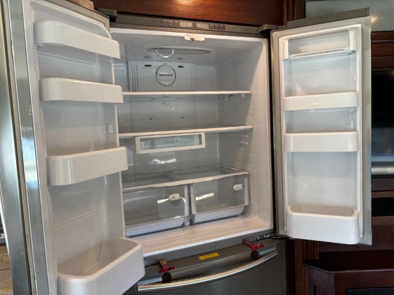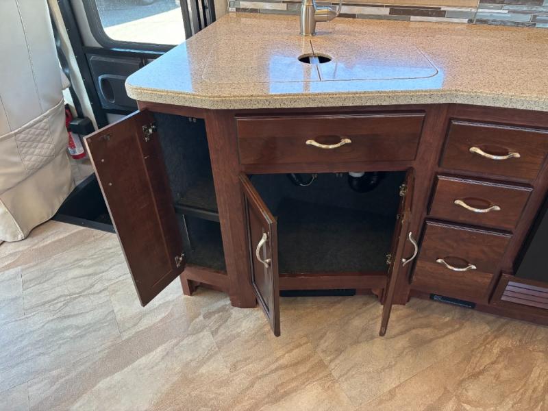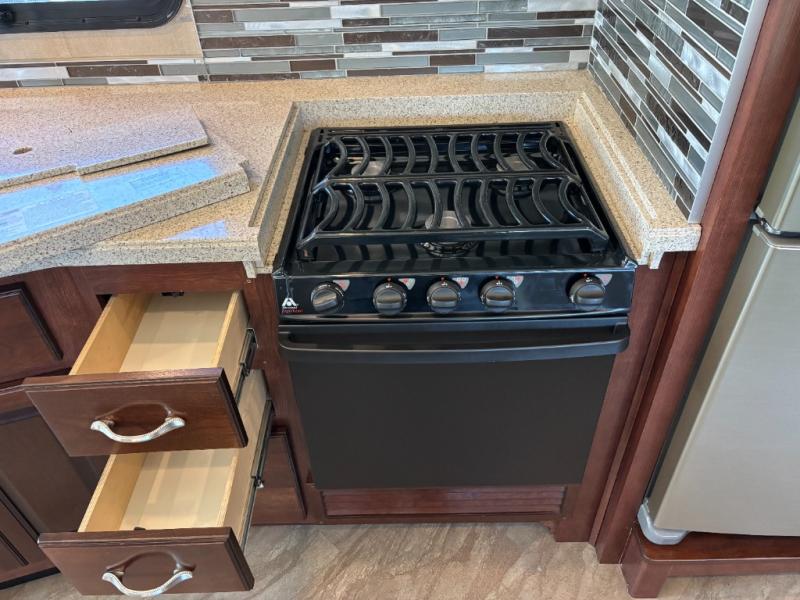 Along the curb side find a kitchen area that will allow you to cook meals and snacks with ease. There is a double sink, a three burner range with overhead microwave oven, and a residential refrigerator so you can take along plenty of food to keep you on your journey.